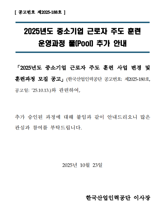 2025년도 중소기업 근로자 주도 훈련 운영과정 풀(Pool) 추가 안내 작성자 박정태 작성일 2025-10-23 조회수 189 첨부파일 2025년 중소기업 근로자 주도 훈련과정 풀(Pool)(251023).xlsx [2319302 byte] 우리 공단에서 금년도 신규로 추진하는 "중소기업 근로자 주도 훈련"과 관련하여, 지원과정을 추가로 선정하여 아래와 같이 안내드립니다. 상세 과정은 붙임 파일을 참고하시어 많은 참여를 부탁드립니다. 목록