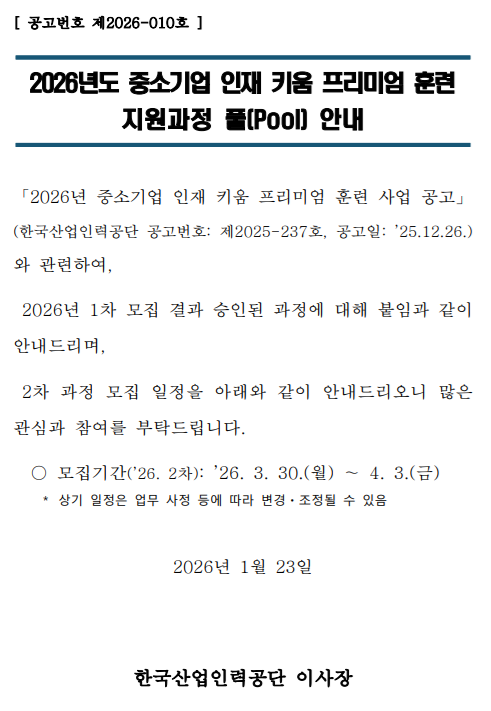 2026년 중소기업 인재 키움 프리미엄 훈련 지원과정 풀(Pool) 안내