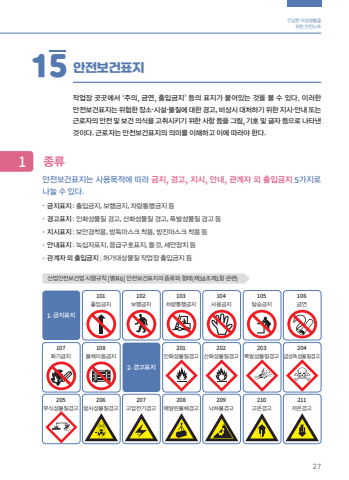 27%uac74%uac15%ud55c %uc9c1%uc7a5%uc0dd%ud65c%uc744%uc704%ud55c %uc548%uc804%ub178%ud2b8%uc548%uc804%ubcf4%uac74%ud45c%uc9c0%ub294 %uc0ac%uc6a9%ubaa9%uc801%uc5d0 %ub530%ub77c %uae08%uc9c0, %uacbd%uace0, %uc9c0%uc2dc, %uc548%ub0b4, %uad00%uacc4%uc790 %uc678 %ucd9c%uc785%uae08%uc9c0 5%uac00%uc9c0%ub85c%ub098%ub20c %uc218 %uc788%ub2e4. %uae08%uc9c0%ud45c%uc9c0 : %ucd9c%uc785%uae08%uc9c0, %ubcf4%ud589%uae08%uc9c0, %ucc28%ub7c9%ud1b5%ud589%uae08%uc9c0 %ub4f1 %uacbd%uace0%ud45c%uc9c0 : %uc778%ud654%uc131%ubb3c%uc9c8 %uacbd%uace0, %uc0b0%ud654%uc131%ubb3c%uc9c8 %uacbd%uace0, %ud3ed%ubc1c%uc131%ubb3c%uc9c8 %uacbd%uace0 %ub4f1 %uc9c0%uc2dc%ud45c%uc9c0 : %ubcf4%uc548%uacbd%ucc29%uc6a9, %ubc29%ub3c5%ub9c8%uc2a4%ud06c %ucc29%uc6a9, %ubc29%uc9c4%ub9c8%uc2a4%ud06c %ucc29%uc6a9 %ub4f1 %uc548%ub0b4%ud45c%uc9c0 : %ub179%uc2ed%uc790%ud45c%uc9c0, %uc751%uae09%uad6c%ud638%ud45c%uc9c0, %ub4e4%uac83, %uc138%uc548%uc7a5%uce58 %ub4f1 %uad00%uacc4%uc790 %uc678 %ucd9c%uc785%uae08%uc9c0 : %ud5c8%uac00%ub300%uc0c1%ubb3c%uc9c8 %uc791%uc5c5%uc7a5 %ucd9c%uc785%uae08%uc9c0 %ub4f115 %uc548%uc804%ubcf4%uac74%ud45c%uc9c01 %uc885%ub958%uc791%uc5c5%uc7a5 %uacf3%uacf3%uc5d0%uc11c %u2018%uc8fc%uc758, %uae08%uc5f0, %ucd9c%uc785%uae08%uc9c0%u2019 %ub4f1%uc758 %ud45c%uc9c0%uac00 %ubd99%uc5b4%uc788%ub294 %uac83%uc744 %ubcfc %uc218 %uc788%ub2e4. %uc774%ub7ec%ud55c%uc548%uc804%ubcf4%uac74%ud45c%uc9c0%ub294 %uc704%ud5d8%ud55c %uc7a5%uc18c%u00b7%uc2dc%uc124%u00b7%ubb3c%uc9c8%uc5d0 %ub300%ud55c %uacbd%uace0, %ube44%uc0c1%uc2dc %ub300%ucc98%ud558%uae30 %uc704%ud55c %uc9c0%uc2dc%u00b7%uc548%ub0b4 %ub610%ub294%uadfc%ub85c%uc790%uc758 %uc548%uc804 %ubc0f %ubcf4%uac74 %uc758%uc2dd%uc744 %uace0%ucde8%uc2dc%ud0a4%uae30 %uc704%ud55c %uc0ac%ud56d %ub4f1%uc744 %uadf8%ub9bc, %uae30%ud638 %ubc0f %uae00%uc790 %ub4f1%uc73c%ub85c %ub098%ud0c0%ub0b8%uac83%uc774%ub2e4. %uadfc%ub85c%uc790%ub294 %uc548%uc804%ubcf4%uac74%ud45c%uc9c0%uc758 %uc758%ubbf8%ub97c %uc774%ud574%ud558%uace0 %uc774%uc5d0 %ub530%ub77c%uc57c %ud55c%ub2e4.%uc0b0%uc5c5%uc548%uc804%ubcf4%uac74%ubc95 %uc2dc%ud589%uaddc%uce59 [%ubcc4%ud45c6] %uc548%uc804%ubcf4%uac74%ud45c%uc9c0%uc758 %uc885%ub958%uc640 %ud615%ud0dc(%uc81c38%uc870%uc81c1%ud56d %uad00%ub828)1. %uae08%uc9c0%ud45c%uc9c0107%ud654%uae30%uae08%uc9c0205%ubd80%uc2dd%uc131%ubb3c%uc9c8%uacbd%uace0101%ucd9c%uc785%uae08%uc9c0108%ubb3c%uccb4%uc774%ub3d9%uae08%uc9c0206%ubc29%uc0ac%uc131%ubb3c%uc9c8%uacbd%uace0103%ucc28%ub7c9%ud1b5%ud589%uae08%uc9c0201%uc778%ud654%uc131%ubb3c%uc9c8%uacbd%uace0208%ub9e4%ub2ec%ub9b0%ubb3c%uccb4%uacbd%uace0105%ud0d1%uc2b9%uae08%uc9c0203%ud3ed%ubc1c%uc131%ubb3c%uc9c8%uacbd%uace0210%uace0%uc628%uacbd%uace0102%ubcf4%ud589%uae08%uc9c02. %uacbd%uace0%ud45c%uc9c0207%uace0%uc555%uc804%uae30%uacbd%uace0104%uc0ac%uc6a9%uae08%uc9c0202%uc0b0%ud654%uc131%ubb3c%uc9c8%uacbd%uace0209%ub099%ud558%ubb3c%uacbd%uace0106%uae08%uc5f0204%uae09%uc131%ub3c5%uc131%ubb3c%uc9c8%uacbd%uace0211%uc800%uc628%uacbd%uace026%uc608%ube44%uc0b0%uc5c5%uc778%ub825%uc744%uc704%ud55c %uc548%uc804%ubcf4%uac74%ub098%uce68%ubc18 %ucde8%uae09%ubb3c%uc9c8%uc758 %uc720%ud574%ubb3c%uc9c8 %ucde8%uae09 %uc804, %ubc18%ub4dc%uc2dc %ubb3c%uc9c8%uc548%uc804%ubcf4%uac74%uc790%ub8cc(MSDS)%ub97c %ucc38%uace0 %ud55c%ub2e4. %uc720%ud574%u00b7%uc704%ud5d8%uc131 %ubc0f %uc801%uc815 %ubcf4%ud638%uad6c, %ube44%uc0c1 %uc2dc %ub300%uc751%uc694%ub839%uc744 %uc219%uc9c0%ud55c%ub2e4. %uc720%ud574%ubb3c%uc9c8%uc744 %ube44%uc0b0%uc2dc%ud0a4%uac70%ub098 %ubc14%ub2e5%uc5d0 %ud758%ub9ac%uc9c0 %uc54a%ub294%ub2e4. %uc720%ud574%ubb3c%uc9c8%uc774 %ub4e4%uc5b4%uac00 %uc788%ub294 %uc6a9%uae30(%ub4e4%uc5b4%uc788%ub358 %ube48 %uc6a9%uae30%ub3c4)%ub294 %ubc00%ud3d0%ud574 %uc720%ud574%ubb3c%uc9c8%uc774 %uacf5%uae30 %uc911%uc5d0 %ub0a0%ub9ac%uac70%ub098 %uac00%uc2a4%uac00%ubc1c%uc0dd%ub418%uc9c0 %uc54a%ub3c4%ub85d %ud55c%ub2e4. %uc720%ud574%ubb3c%uc9c8%uc744 %uc784%uc758%ub85c %uac16%uace0 %ub2e4%ub2c8%uac70%ub098 %ub2e4%ub978 %uc791%uc5c5%uc7a5%uc73c%ub85c %uc62e%uae30%uc9c0 %uc54a%ub294%ub2e4. %uc720%ud574%ubb3c%uc9c8 %ucde8%uae09 %ud6c4 %uc2dd%uc0ac%ub97c %ud574%uc57c%ud560 %uacbd%uc6b0, %uc190%uc744 %uae68%ub057%uc774 %uc53b%ub294%ub2e4. %uc791%uc5c5%ubcf5%uc744 %ucc29%uc6a9%ud55c %ucc44 %uc2dd%uc0ac%ub97c %ud558%uac70%ub098 %uadc0%uac00%ud558%uc9c0 %uc54a%ub294%ub2e4. %uac74%uac15%ubcf4%ud638%uc7a5%uce58%ub098%ubcf4%ud638%uad6c%ub294%uc815%ud574%uc9c4%ubc29%ubc95%uc73c%ub85c%ud65c%uc6a9%ud558%uace0%uc790%uc2e0%uc758%uac10%uac01%ub9cc%uc73c%ub85c%uc0ac%uc6a9%uc5ec%ubd80%ub97c%ud310%ub2e8%ud558%uc9c0%uc54a%ub294%ub2e4. %uc720%ud574%ubb3c%uc9c8%uc740 %ucde8%uae09 %uc791%uc5c5 %ud6c4 %uccad%uc18c%ub97c %uae68%ub057%uc774 %ud574%uc57c %ud55c%ub2e4. %uc791%uc5c5 %uc911%uc758 %uc9c1%uc811%uc801%uc778 %ub178%ucd9c%ubcf4%ub2e4 %uba3c%uc9c0%ub098 %uc624%uc5fc%uc6d0%uc758 %uac04%uc811%uc801%uc778 %ub178%ucd9c%uc744 %uc778%uc9c0%ud558%uc9c0 %ubabb%ud558%ub294 %uacbd%uc6b0%uac00 %ub9ce%uc544 %ub354%uc704%ud5d8%ud560 %uc218 %uc788%uae30 %ub54c%ubb38%uc774%ub2e4. %uc720%ud574%ubb3c%uc9c8%uc758 %ud45c%uc9c0%ub294 %uc81c%uac70%ud558%uac70%ub098, %ub2e4%ub978 %uc7a5%uc560%ubb3c%ub85c %uac00%ub824%uc9c0%uc9c0 %uc54a%ub3c4%ub85d %uc8fc%uc758%ud55c%ub2e4.14 %uc720%ud574%ubb3c%uc9c8 %ucde8%uae0912%uad00%ub9ac%ub300%uc0c1 %uc720%ud574%ubb3c%uc9c8%uc758 %uc885%ub958%ucde8%uae09 %uc2dc %uc8fc%uc758%uc0ac%ud56d%uc720%ud574%ubb3c%uc9c8%uc740 %uc0dd%uc0b0%ud604%uc7a5%ub9cc%uc774 %uc544%ub2c8%ub77c %uc0ac%ubb34%uc2e4%uc5d0%uc11c %uc0ac%uc6a9%ub418%ub294 %uc124%ube44%ub098 %ubb3c%ud488%uc5d0%ub3c4 %ub4e4%uc5b4%uac00 %uc788%ub2e4.%uc720%ud574%ubb3c%uc9c8%uc740 %uac74%uac15 %uc7a5%ud574%ub97c %ubc1c%uc0dd%uc2dc%ud0ac %uc218 %uc788%uace0, %ub208%uc5d0 %ubcf4%uc774%uc9c0 %uc54a%uae30 %ub54c%ubb38%uc5d0 %ub354 %uc704%ud5d8%ud558%ub2e4.%uc720%ud574%ubb3c%uc9c8 %ucde8%uae09 %uc2dc%uc5d0%ub294 %uadf8 %uc131%uc0c1 %ubc0f %ucde8%uae09%ubc29%ubc95%uc744 %uc798 %uc54c%uc544%uc57c %uac74%uac15 %uc7a5%ud574%ub3c4 %uc608%ubc29%ud560 %uc218 %uc788%ub2e4.%uad6c %ubd84 %uc885 %ub958%uc720%uae30%ud654%ud569%ubb3c %uae00%ub8e8%ud0c
