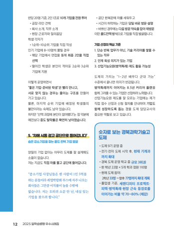 %ubc18%ub2f9 20%uba85 %uae30%uc900, 2%uc778 1%uc870%ub85c 10%uac1c %uae30%uc5c5%uc744 %uc804%uc6d0 %ud22c%uc5b4%u2022%uacf5%uc7a5%u00b7%ub77c%uc778 %uacac%ud559%u2022%ud68c%uc0ac %uc18c%uac1c, %uc9c1%ubb34 %uc18c%uac1c%u2022%ud604%uc7a5 %uadfc%ub85c%uc790%uc640 %uc9c8%uc758%uc751%ub2f5%ud559%uc0dd %uac01%uc790%uac00%u20221%uc21c%uc704~10%uc21c%uc704 %uae30%uc5c5%uc744 %uc9c1%uc811 %uc791%uc131%uc778%uae30 %uae30%uc5c5%uc5d0 8~10%uba85%uc529 %ubab0%ub9b4 %uacbd%uc6b0%u2022%ud574%ub2f9 %uae30%uc5c5%uc5d0%uc11c %uba74%uc811%uc744 %ud1b5%ud574 %ucd5c%uc885 2%uc778%uc744 %uc9c1%uc811 %uc120%ud0dd%u2022%ub5a8%uc5b4%uc9c4 %ud559%uc0dd%uc740 %ubcf8%uc778%uc774 %uc801%uc5b4%ub454 2%uc21c%uc704%u00b73%uc21c%uc704%uae30%uc5c5%uc5d0 %uc9c0%uc6d0%uc774%ub807%uac8c %uc6b4%uc601%ud558%uba74%uc11c%u201c%uc88b%uc740 %uae30%uc5c5%u2013%uc900%ube44%ub41c %ud559%uc0dd%u201d%uc740 %ube68%ub9ac %ub9cc%ub098%uace0,%uc11c%ub85c %ub9de%uc9c0 %uc54a%ub294 %uacbd%uc6b0%ub294 %uc904%uc774%ub294 %uad6c%uc870%ub97c %ub9cc%ub4e4%uc5b4%uac00%uace0 %uc788%uc2b5%ub2c8%ub2e4.%ubb3c%ub860, %ub9c8%uc9c0%ub9c9 %uc21c%uc704 %uae30%uc5c5%uc5d0 %ubc30%uc815%ub41c %ud559%uc0dd%ub4e4%uc758%ubd88%ub9cc%uc774%ub77c%ub294 %uc219%uc81c%ub3c4 %ub0a8%uc544 %uc788%uc2b5%ub2c8%ub2e4.%ud558%uc9c0%ub9cc %u201c%uc120%ud0dd %uacfc%uc815%uc5d0 %ubcf8%uc778%uc774 %ucc38%uc5ec%ud588%ub2e4%u201d%ub294 %uc810 %ub355%ubd84%uc5d0%uc608%uc804%ubcf4%ub2e4 %uc911%ub3c4 %ud0c8%ub77d%ub960%uc740 %ud655%uc5f0%ud788 %ub0ae%uc544%uc84c%uc2b5%ub2c8%ub2e4.5. %u2018%ucc28%uc5d0 %uc2dc%ub3d9 %uac78%uace0 %uacf5%ub2e8%uc73c%ub85c %ub4e4%uc5b4%uac11%ub2c8%ub2e4%u2019%uc228%uc740 %uac15%uc18c%uae30%uc5c5%uc744 %ucc3e%ub294 %ucf5c%ub4dc %ucee8%ud0dd %uae30%uc5c5 %ubc1c%uad74%uc591%uc9c8%uc758 %uae30%uc5c5 %uc5c6%uc774%ub294 %uc544%ubb34%ub9ac %ub3c4%uc81c%ub97c %uc798 %uc124%uacc4%ud574%ub3c4%uc18c%uc6a9%uc774 %uc5c6%uc2b5%ub2c8%ub2e4.%uc800%ub294 %uc9c0%uae08%ub3c4 %uc9c1%uc811 %ucc28%ub97c %ubab0%uace0 %uacf5%ub2e8%uc5d0 %ub4e4%uc5b4%uac11%ub2c8%ub2e4.%u201c%uc911%uc18c%uae30%uc5c5 %uc0ac%uc7a5%ub2d8%ub4e4%uc740 %ud55c %uc0ac%ub78c%uc774 1%uc778 5%uc5ed%uc744 %ud558%ub294 %ubd84%ub4e4%uc774%ub77c %ucde8%uc5c5%ubc15%ub78c%ud68c %ubd80%uc2a4%uc5d0 %uc790%uc8fc %ub098%uc624%ub294 %ud68c%uc0ac%ub4e4%uc740 %uadf8%ub9cc%ud07c %uc774%uc9c1%ub960%uc774 %ub192%uc744 %uc218%ubc16%uc5d0 %uc5c6%uc2b5%ub2c8%ub2e4. %uc800%ub294 %uc624%ud788%ub824 %uc18c%ubb38 %uc548 %ub09c, %ub0b4%uc2e4 %uc788%ub294 %uae30%uc5c5%uc744 %ucc3e%uc73c%ub824 %ud569%ub2c8%ub2e4.%u201d%u2022%uacf5%ub2e8 %ud55c%ubcf5%ud310%uc5d0 %ucc28%ub97c %uc138%uc6cc%ub450%uace0%u2022%uc2dc%uac04%uc774 %ud5c8%ub77d%ud558%ub294 %uae30%uc5c5%uc740 %ub2f9%uc77c %ubc14%ub85c %ubc29%ubb38%u00b7%uc124%uba85%u2022%ubc14%uc058%uc2e0 %uacbd%uc6b0%uc5d0%ub294 %ub2e4%uc74c %ubc29%ubb38 %uc57d%uc18d%uc744 %uc7a1%uc544 %uc7ac%ubc29%ubb38%uc774%ub7f0 %ucf5c%ub4dc%ucee8%ud0dd %ubc29%uc2dd%uc73c%ub85c %uae30%uc5c5%uc744 %uc9c1%uc811 %ubc1c%uad74%ud569%ub2c8%ub2e4.%uae30%uc5c5 %uc120%uc815%uc758 %ud575%uc2ec %uae30%uc9001. %ub2e8%uc21c %ubc18%ubcf5 %uc5c5%ubb34%uac00 %uc544%ub2cc, %uae30%uc220 %ucee4%ub9ac%uc5b4%ub97c %uc313%uc744 %uc218 %uc788%ub294 %uc9c1%ubb342. %uc778%uc7ac %uc721%uc131 %uc758%uc9c0%uac00 %uc788%ub294 %uae30%uc5c53. %uc0b0%uc5c5%uae30%ub2a5%uc694%uc6d0(%ubcd1%uc5ed%ud2b9%ub840) %uc81c%ub3c4 %ud65c%uc6a9 %uac00%ub2a5%uc131%ub3c4%uc81c%uc758 %uac00%uce58%ub294 %u201c1~2%ub144 %ubc30%uc6b0%ub2e4 %uad70%ub300 %uac00%ub294%u201d%uc218%uc900%uc5d0%uc11c %ub05d%ub098%uba74 %uc758%ubbf8%uac00 %ubc18%uac10%ub429%ub2c8%ub2e4.%ubcd1%uc5ed%ud2b9%ub840%uae4c%uc9c0 %uc774%uc5b4%uc9c0%ub294 8.5%ub144 %ucee4%ub9ac%uc5b4 %ud50c%ub79c%uc744%ud568%uaed8%uadf8%ub824%uc904%uc218%uc788%ub294%uae30%uc5c5%ub9cc%uc120%uc815%ud558%ub824%ub178%ub825%ud569%ub2c8%ub2e4.%uc0b0%uc5c5%uae30%ub2a5%uc694%uc6d0 %uc81c%ub3c4%ub97c %uc798 %ubaa8%ub974%ub294 %uae30%uc5c5%uc5d0%ub294 %uc81c%uac00%uc9c1%uc811 %uc810%uc218 %uc0b0%uc815%uacfc %uc2e0%uccad %uc808%ucc28%ub97c %uc548%ub0b4%ud558%uba70 %uae30%uc5c5%ub3c4 %ud568%uaed8 %uc131%uc7a5%ud558%ub3c4%ub85d %ub3d5%ub294 %uac83%uc744 %ub3c4%uc81c %ub2f4%ub2f9%uad50%uc0ac%uc758%uc911%uc694%ud55c %uc5ed%ud560%ub85c %ubcf4%uace0 %uc788%uc2b5%ub2c8%ub2e4.%uc22b%uc790%ub85c %ubcf4%ub294 %uacbd%ubd81%uacfc%ud559%uae30%uc220%uace0 %ub3c4%uc81c%u2022%ub3c4%uc81c 9%uae30 %uc6b4%uc601 %uc911%u2022%uc804%uae30%u00b7%uc804%uc790 %ub3c4%uc81c %uc2dc%uc791 %ud6c4, %ud604%uc7ac %uae30%uacc4%uacfc%uae4c%uc9c0 %ud655%ub300%u2022%uacbd%ubd81 %ub3c4%uc81c %uc6b4%uc601 %ud559%uad50 %uc911 %uaddc%ubaa8 3%uc704%uad8c%u2022%ud55c %ud559%ub144 22%uba85 %u00d7 5%uac1c %ud559%uacfc %uc815%uc6d0 110%uba85%u2022%ud604%uc7ac %ub3c4%uc81c %ucc38%uc5ec:2%ud559%ub144 33%uba85%u2192 %ud5a5%ud6c4 77%uba85%uae4c%uc9c0 %ud655%ub300 %uacc4%ud68d%u2022%uc878%uc5c5%uc0dd %uae30%uc900, %uc138%ub80c%ub514%ud53c%ud2f0 %ud504%ub85c%uc81d%ud2b8%u00b7%ud53c%ud14d%u00b7%ubcd1%uc5ed%ud2b9%ub840%u00b7%ud604%uc7a5 %uadfc%uc18d %ub4f1%uacbd%ub85c%ub97c %uc774%uc5b4%uac00%ub294 %ube44%uc728 %uc57d 70~80% (%uccb4%uac10)12 2025 %uc77c%ud559%uc2b5%ubcd1%ud589 %uc6b0%uc218%uc0ac%ub840%uc9d1%uace0%uad50%uc77c%ud559%uc2b5%ubcd1%ud589 %uc6b0%uc218%uc0ac%ub840%uc9d1_1223.indd 12 2025. 12. 24. %uc624%uc804 11:39