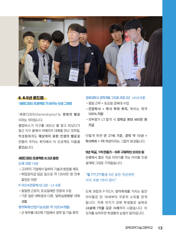 6. 8.5%ub144 %ub85c%ub4dc%ub9f5%u2018%uc138%ub80c%ub514%ud53c%ud2f0 %ud504%ub85c%uc81d%ud2b8%u2019%uac00 %ubc14%uafb8%ub294 %uc778%uc0dd %uadf8%ub798%ud504%u2018%uc138%ub80c%ub514%ud53c%ud2f0(Serendipity)%u2019%ub294 %ub73b%ubc16%uc758 %ud589%uc6b4%uc774%ub77c%ub294 %uc758%ubbf8%uc785%ub2c8%ub2e4.%ucf5c%ub7fc%ubc84%uc2a4%uac00 %uc9c0%uad6c%ub97c %ub124%ubaa8%ub09c %uc904 %uc54c%uace0 %ub5a0%ub0ac%ub2e4%uac00%ub465%uadfc %uc9c0%uad6c %ub05d%uc5d0%uc11c %uc544%uba54%ub9ac%uce74 %ub300%ub959%uc744 %ub9cc%ub09c %uac83%ucc98%ub7fc,%ud559%uc0dd%ub4e4%uc5d0%uac8c%ub3c4 %uc608%uc0c1%ud558%uc9c0 %ubabb%ud55c %uc778%uc0dd%uc758 %ud589%uc6b4%uc744%ub9cc%ub4e4%uc5b4 %uc8fc%uc790%ub294 %ucde8%uc9c0%uc5d0%uc11c %uc774 %ud504%ub85c%uc81d%ud2b8 %uc774%ub984%uc744%ubd99%uc600%uc2b5%ub2c8%ub2e4.%uc138%ub80c%ub514%ud53c%ud2f0 %ud504%ub85c%uc81d%ud2b8 8.5%ub144 %ud50c%ub79c%ub3c4%uc81c %uacfc%uc815 1.5%ub144%u2022%uace03%uae4c%uc9c0 %uae30%uc5c5%uc5d0%uc11c %uc77c%ud558%uba70 %uae30%uc220%uacfc %ud604%uc7a5%uc744 %uccb4%ub4dd%u2022%ucde8%uc5c5%uc7a5%ub824%uae08%u00b7%uc784%uae08 %ub4f1%uc73c%ub85c %uc57d 1,500%ub9cc %uc6d0 %uc804%ud6c4%uc885%uc7a3%ub3c8 %ub9c8%ub828P-TECH(%uc804%ubb38%ud559%uc0ac) 2%ub144 %u2013 L3 %uc218%uc900%u2022%ud3c9%uc77c%uc5d4 %uadfc%ub85c%uc790, %ud1a0%uc694%uc77c%uc5d0%ub9cc %uc804%ubb38%ub300 %uc218%uc5c5%u2022%uae30%uc874 %uc77c%ubc18 %ub300%ud559%uc0dd%uacfc %ub2e4%ub978, %u2018%uc77c%ud559%uc2b5%ubcd1%ud589%ud615%u2019 %ub300%ud559%uc0dd%ud65c%ubcd1%uc5ed%ud2b9%ub840(%uc0b0%uc5c5%uae30%ub2a5%uc694%uc6d0) %uc57d 3%ub144(34%uac1c%uc6d4)%u2022%uad70 %ubcf5%ubb34%ub97c %ub300%uc2e0%ud574 %uae30%uc5c5%uc5d0%uc11c %uacbd%ub825 %ubc0f %uae30%uc220 %ucd95%uc801%uacbd%ubd81%ub300%ud559%uad50 %uacbd%ub825%uac1c%ubc1c %uace0%ub3c4%ud654 %uacfc%uc815 2%ub144 %u2013 L4%u00b7L5 %uc218%uc900%u2022%ud3c9%uc77c %uadfc%ubb34 + %ud1a0%uc694%uc77c %uacbd%ubd81%ub300 %uc218%uc5c5%u2022%uc804%ubb38%ud559%uc0ac + %ud559%uc0ac %ud559%uc704 %ucde8%ub4dd, %ud559%ube44%ub294 %uad6d%uac00 100% %uc9c0%uc6d0%u2022%uc678%ubd80%ud3c9%uac00 L3 %ud569%uaca9 %uc2dc %uc7a5%ud559%uae08 %ucd5c%ub300 480%ub9cc %uc6d0 %uc9c0%uae09%uc774%ub807%uac8c %ud558%uba74 %ub9cc 27%uc138 %uae30%uc900, %uacbd%ub825 %uc57d 10%ub144 + %ud559%uc0ac%ud559%uc704 + 1%uc5b5 %uc790%uc0b0%uc774%ub77c%ub294 %uadf8%ub9bc%uc774 %uc644%uc131%ub429%ub2c8%ub2e4.9%ub144 %uc801%uae08, 1%uc5b5 %ub9cc%ub4e4%uae30 %u2013 %uc544%uc8fc %uad6c%uccb4%uc801%uc778 %uc22b%uc790%uc758 %ud798%uc740%ud589%uc5d0%uc11c %ub4e4%uc740 %uc801%uae08 %uc774%uc57c%uae30%ub97c %uc800%ub294 %uc544%uc774%ub4e4 %uc778%uc0dd%uc124%uacc4%uc5d0 %uadf8%ub300%ub85c %uac00%uc838%uc654%uc2b5%ub2c8%ub2e4.%u201c%uc6d4 777,777%uc6d0%uc744 9%ub144 %ub3d9%uc548 %uc801%uae08%ud558%uba74 %uc774%uc790 %ud3ec%ud568 1%uc5b5%uc774 %ub41c%ub2e4.%u201d%ub3c4%uc81c %uacfc%uc815%uacfc P-TECH, %ubcd1%uc5ed%ud2b9%ub840%ub97c %uac70%uce58%ub294 %ub3d9%uc548%uc544%uc774%ub4e4%uc740 %ub9cc 18%uc138%ubd80%ud130 %uafb8%uc900%ud788 %uc18c%ub4dd%uc744 %uc5bb%uac8c%ub429%ub2c8%ub2e4. %uc800%ucd95 %uc758%uc9c0%uac00 %uac15%ud55c %ud559%uc0dd%ub4e4%uc740 %uc2e4%uc81c%ub85c24%uc0b4%uc5d0 1%uc5b5%uc744 %ubaa8%uc740 %uc0ac%ub840%uae4c%uc9c0 %ub098%uc654%uc2b5%ub2c8%ub2e4. %uc774%uc22b%uc790%ub97c %ubcf4%uc5ec%uc8fc%uba74 %ud559%uc0dd%ub4e4%uc758 %ub208%ube5b%uc774 %ub2ec%ub77c%uc9d1%ub2c8%ub2e4.%uacbd%ubd81%uacfc%ud559%uae30%uc220%uace0%ub4f1%ud559%uad50 13%uace0%uad50%uc77c%ud559%uc2b5%ubcd1%ud589 %uc6b0%uc218%uc0ac%ub840%uc9d1_1223.indd 13 2025. 12. 24. %uc624%uc804 11:39