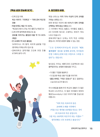 [%ud575%uc2ec %uc131%uacfc %ud55c%ub208%uc5d0 %ubcf4%uae30]%u2022%ub3c4%uc81c %ub3c4%uc785 %uc774%ud6c4,%u0009%ud559%uad50 %uc774%ubbf8%uc9c0: %u2018%uae30%ud53c%ud559%uad50%u2019 %u2192 %u2018%ubbf8%ub798 %uc900%ube44 %ud559%uad50%u2019%ub85c %uc804%ud658%u2022%ud559%uc0dd %ub9cc%uc871%ub3c4 %uccb4%uac10 70~80%,%u201c%ud559%uad50%ubcf4%ub2e4 %ud68c%uc0ac %ub098%uac00%ub294 %uac8c %ub354 %uc88b%ub2e4%u201d%ub294 %ud559%uc0dd %ub2e4%uc218%u2022%ub3c4%uc81c%u00b7%ud53c%ud14d%u00b7%ubcd1%uc5ed%ud2b9%ub840%u00b7%ud604%uc7a5%uadfc%uc18d %ub4f1%u0009%uacbd%ub85c%ub97c %uc774%uc5b4%uac00%ub294 %uc878%uc5c5%uc0dd %ube44%uc728 %uc57d 70~80% (%uccb4%uac10)%u2022%ub9cc 24%uc138%uc5d0 1%uc5b5 %ubaa8%uc740 %uc878%uc5c5%uc0dd, SK%ud558%uc774%ub2c9%uc2a4 1%ucc28 %ud569%uaca9, %uc678%uad6d%uacc4 %uae00%ub85c%ubc8c %uae30%uc5c5(%ud55c%uad6d%uc5d0%uc2a4%uc9c0%uc5d0%uc2a4(%uc8fc)) %uc785%uc0ac %ub4f1%u2022%uacbd%ubd81%ub300%ud559%uad50 %uacbd%ub825%uac1c%ubc1c %uace0%ub3c4%ud654 %uacfc%uc815 %uc9c4%ucd9c6%uae30%ubd80%ud130 %ubcf8%uaca9 %uc2dc%uc7919. %uc55e%uc73c%ub85c%uc758 %ubc14%ub78c%ub3c5%uc77c%u00b7%uc2a4%uc704%uc2a4%ub294 %uc774%ubbf8 70% %uc774%uc0c1%uc774 %ub3c4%uc81c %uad50%uc721%uc744 %uac70%uce58%ub294 %ub098%ub77c%uc785%ub2c8%ub2e4.%ubc18%uba74 %ud55c%uad6d%uc740 %uc5ec%uc804%ud788 85~90%%uac00 %ub300%ud559 %uc9c4%ud559%uc744 %uc120%ud0dd%ud558%ub294 %ud559%ub825 %uc911%uc2ec %uc0ac%ud68c%uc785%ub2c8%ub2e4.%uadf8 %uc0ac%uc774%uc5d0%uc11c %ubd80%ubaa8%ub3c4 %ud798%ub4e4%uace0, %uc544%uc774%ub4e4%ub3c4 %ud798%ub4e4%uace0,40~50%ub300%uc5d0 %ube5a%uc73c%ub85c %uace0%uc0dd%ud558%ub294 %uc138%ub300%uac00 %uacc4%uc18d%ub098%uc624%uace0 %uc788%uc2b5%ub2c8%ub2e4.%uacbd%ubd81%uacfc%ud559%uae30%uc220%uace0 %ub3c4%uc81c%ub294 %uc544%uc9c1 %uc791%uc740 %uc0ac%ub840%uc77c%ubfd0%uc785%ub2c8%ub2e4. %ud558%uc9c0%ub9cc %ubd84%uba85%ud788 %ub9d0%ud560 %uc218 %uc788%ub294 %uac83%uc740,%u201c%uace0%uad50 %ub2e8%uacc4%uc5d0%uc11c%ubd80%ud130%ub2a5%ub825 %uc911%uc2ec%uc758 %u2018%ub124%uc624 %ube14%ub8e8%uce7c%ub77c%u2019 %uacbd%ub85c%ub97c %uc124%uacc4%ud574 %uc900%ub2e4%uba74, %uc544%uc774%ub4e4%uc758 %uc778%uc0dd %uadf8%ub798%ud504%ub294%uc804%ud600 %ub2e4%ub978 %ubaa8%uc591%uc73c%ub85c %uadf8%ub824%uc9c8 %uc218 %uc788%ub2e4%u201d%ub294 %uac83%uc785%ub2c8%ub2e4.%uc55e%uc73c%ub85c%ub3c4 %uc6b0%ub9ac%ub294 %uc138%ub80c%ub514%ud53c%ud2f0 %ud504%ub85c%uc81d%ud2b8%uc640 %ub124%uc624%ube14%ub8e8%uce7c%ub77c%ub77c%ub294 %ubd84%uba85%ud55c %ubc29%ud5a5%uc131%uc744 %uac00%uc9c0%uace0,%u2022%ub354 %uc88b%uc740 %uae30%uc5c5%uc744 %ubc1c%uad74%ud558%uace0%u2022%ub354 %uc815%uad50%ud55c %ud559%uc0dd %uc120%ubc1c%u00b7%uc9c0%ub3c4%ub97c %uc774%uc5b4%uac00%uba70%u2022%uc878%uc5c5 %ud6c4%uc5d0%ub3c4 %u201c1%uc5b5%uc740 %ubaa8%uc558%ub0d0?%u201d %ubb3b%uace0 %uc751%uc6d0%ud558%ub294%uc2a4%uc2b9%uc73c%ub85c %ub0a8%uace0%uc790 %ud569%ub2c8%ub2e4.%uc6b0%uc218%uc0ac%ub840%uc9d1%uc744 %ud1b5%ud574 %uc6b0%ub9ac %ud559%uad50%uc758 %uacbd%ud5d8%uc774 %ub354 %ub9ce%uc740%ud559%uad50%uc640 %ub098%ub204%uc5b4%uc9c0%uace0, %ub354 %ub9ce%uc740 %uc544%uc774%ub4e4%uc758 %ub73b%ubc16%uc758%ud589%uc6b4(Serendipity) %uc73c%ub85c %uc774%uc5b4%uc9c0%uae30%ub97c %uc9c4%uc2ec%uc73c%ub85c%ubc14%ub78d%ub2c8%ub2e4.%u201c%uc800%uc758 %uc791%uc740 %ubaa9%ud45c%uc774%uc790 %uafc8%uc74020%ub300%uc5d0 %ub3c4%uc81c%ub97c %uc2dc%uc791%ud574%uc11c1%uc5b5%uc744 %ubaa8%uc740 %uc81c%uc790%ub97c 100%uba85%uc744 %ub9cc%ub4e0%ub294 %uac83%uc774 1%ucc28 %ubaa9%ud45c%uc774%uc790 %uc791%uc740 %uafc8%uc785%ub2c8%ub2e4.%uadf8%ub7fc %uc800%ub294 100%uc5b5%uc758 %uc790%uc0b0%uac00%uac00 %ub418%ub294 %uac70%uaca0%uc8e0~^^%uc0dd%uac01%ub9cc%ud574%ub3c4 %ub108%ubb34 %ud750%ubb47%ud558%uace0 %uc88b%uc2b5%ub2c8%ub2e4.%u201d%uacbd%ubd81%uacfc%ud559%uae30%uc220%uace0%ub4f1%ud559%uad50 15%uace0%uad50%uc77c%ud559%uc2b5%ubcd1%ud589 %uc6b0%uc218%uc0ac%ub840%uc9d1_1223.indd 15 2025. 12. 24. %uc624%uc804 11:39