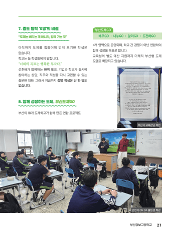 7. %uc911%ub3c4 %ud0c8%ub77d %u20180%uba85%u2019%uc758 %ube44%uacb0 %u2018%ubd80%uc0b0%ub3c4%uc81cGO%u2019%u201c%ub3c4%uc81c%ub294 %ubc84%ud2f0%ub294 %uac8c %uc544%ub2c8%ub77c, %ud568%uaed8 %uac00%ub294 %uac83%u201d%uc544%uc9c1%uae4c%uc9c0 %ub3c4%uc81c%ub97c %ud798%ub4e4%uc5b4%ud574 %uba3c%uc800 %ud3ec%uae30%ud55c %ud559%uc0dd%uc740%uc5c6%uc2b5%ub2c8%ub2e4.%ud559%uad50%ub294 %ub298 %ud559%uc0dd%ub4e4%uc5d0%uac8c %ub9d0%ud569%ub2c8%ub2e4.%u201c%ub108%ud76c%uc758 %ubaa9%ud45c%ub294 %ud589%ubcf5%ud55c %ubd80%uc790%ub2e4.%u201d%uc120%ud6c4%ubc30%uac00 %ud568%uaed8%ud558%ub294 %ud55c%ub07c %ud1a0%ud06c, %uae30%uc5c5%uacfc %ud559%uad50%uac00 %ub3d9%uc2dc%uc5d0%ucc38%uc5ec%ud558%ub294 %uc0c1%ub2f4, %uc9c1%ubb34%uc640 %uc801%uc131%uc744 %ub2e4%uc2dc %uace0%ubbfc%ud560 %uc218 %uc788%ub294%ucda9%ubd84%ud55c %ub300%ud654. %uadf8%ub798%uc11c %uc9c0%uae08%uae4c%uc9c0 %uc911%ud0c8 %ud559%uc0dd%uc740 %ub2e8 %ud55c %uba85%ub3c4 %uc5c6%uc2b5%ub2c8%ub2e4.8. %ud568%uaed8 %uc131%uc7a5%ud558%ub294 %ub3c4%uc81c, %ubd80%uc0b0%ub3c4%uc81cGO%ubd80%uc0b0%uc758 18%uac1c %ub3c4%uc81c%ud559%uad50%uac00 %ud568%uaed8 %ub9cc%ub4e0 %uc5f0%ud569 %ud504%ub85c%uc81d%ud2b8%ubc30%uc6b0GO %u2022 %ub098%ub204GO %u2022 %uc54c%ub9acGO %u2022 %ub3c4%uc804%ud558GO4%uac1c %uc601%uc5ed%uc73c%ub85c %uc6b4%uc601%ub418%uba70, %ud559%uad50 %uac04 %uacbd%uc7c1%uc774 %uc544%ub2cc %uc5f0%ud569%ud558%uc5ec%ud568%uaed8 %uc131%uc7a5%uc744 %ubaa9%ud45c%ub85c %ud569%ub2c8%ub2e4.%uad50%uc721%uccad%uc758 %ubcc4%ub3c4 %uc608%uc0b0 %uc9c0%uc6d0%uae4c%uc9c0 %ub354%ud574%uc838 %ubd80%uc0b0%ud615 %ub3c4%uc81c%ubaa8%ub378%ub85c %ud655%uc7a5%ub418%uace0 %uc788%uc2b5%ub2c8%ub2e4.%uc778%uc5f0%uc774 ON DA %uc878%uc5c5%uc0dd %ud2b9%uac15%ubd80%uc0b0%uc2dc %uad50%uc721%uac10%ub2d8 %ucd95%uc804%ubd80%uc0b0%uc815%ubcf4%uace0%ub4f1%ud559%uad50 21%uace0%uad50%uc77c%ud559%uc2b5%ubcd1%ud589 %uc6b0%uc218%uc0ac%ub840%uc9d1_1223.indd 21 2025. 12. 24. %uc624%uc804 11:39