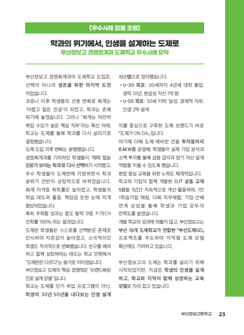 %ubd80%uc0b0%uc815%ubcf4%uace0 %uacbd%uc601%ud68c%uacc4%uacfc%uc758 %ub3c4%uc81c%ud559%uad50 %ub3c4%uc785%uc740,%uc120%ud0dd%uc774 %uc544%ub2c8%ub77c %uc0dd%uc874%uc744 %uc704%ud55c %ub9c8%uc9c0%ub9c9 %ub3c4%uc804%uc774%uc5c8%uc2b5%ub2c8%ub2e4.%ucf54%ub85c%ub098 %uc774%ud6c4 %ud559%uc0dd%ub4e4%uc758 %uc120%ud638 %ubcc0%ud654%ub85c %ud68c%uacc4%ub294%u2018%uc5b4%ub835%uace0 %ud798%ub4e0 %uc804%uacf5%u2019%uc774 %ub418%uc5c8%uace0, %ud559%uacfc%ub294 %uc874%ud3d0%uc704%uae30%uc5d0 %ub193%uc600%uc2b5%ub2c8%ub2e4. %uadf8%ub7ec%ub098 %u201c%ud68c%uacc4%ub294 %uc5ec%uc804%ud788%ucde8%uc5c5 %uc218%uc694%uac00 %ub192%uc740 %ud575%uc2ec %uc9c1%ubb34%u201d%ub77c%ub294 %ud655%uc2e0 %uc544%ub798,%ud559%uad50%ub294 %ub3c4%uc81c%ub97c %ud1b5%ud574 %ud559%uacfc%ub97c %ub2e4%uc2dc %uc0b4%ub9ac%uae30%ub85c%uacb0%uc815%ud588%uc2b5%ub2c8%ub2e4.%ub3c4%uc81c %ub3c4%uc785 %uc774%ud6c4 %ubcc0%ud654%ub294 %ubd84%uba85%ud588%uc2b5%ub2c8%ub2e4.%uacbd%uc601%ud68c%uacc4%uacfc%ub97c %uae30%ud53c%ud558%ub358 %ud559%uc0dd%ub4e4%uc774 %u2018%uc758%ubbf8 %uc788%ub294 %uc9c4%ub85c%uac00 %ubcf4%uc774%ub294 %ud559%uacfc%u2019%ub85c %ub2e4%uc2dc %uc120%ud0dd%ud558%uae30 %uc2dc%uc791%ud588%uace0,%uc6b0%uc218 %ud559%uc0dd%ub4e4%uc774 %ub3c4%uc81c%ubc18%uc5d0 %uc9c0%uc6d0%ud558%uba74%uc11c %ud559%uacfc%ubd84%uc704%uae30 %uc804%ubc18%uc774 %uae0d%uc815%uc801%uc73c%ub85c %ubc14%ub00c%uc5c8%uc2b5%ub2c8%ub2e4.%ud68c%uacc4 %uc790%uaca9%uc99d %ucde8%ub4dd%ub960%uc740 %ub192%uc544%uc84c%uace0, %ud559%uc0dd%ub4e4%uc758%ud559%uc2b5 %ud0dc%ub3c4%uc640 %ucd9c%uacb0, %ucc45%uc784%uac10 %ub610%ud55c %ub208%uc5d0 %ub744%uac8c%ud5a5%uc0c1%ub418%uc5c8%uc2b5%ub2c8%ub2e4.%ud2b9%ud788 %uc8fc%ubaa9%ud560 %uc131%uacfc%ub294 %uc911%ub3c4 %ud0c8%ub77d 0%uba85, P-TECH%uc9c4%ud559%ub960 100% %ub77c%ub294 %uacb0%uacfc%uc785%ub2c8%ub2e4.%ub3c4%uc81c%ubc18 %ud559%uc0dd%ub4e4%uc740 %uc2a4%uc2a4%ub85c%ub97c %uc120%ud0dd%ubc1b%uc740 %uc874%uc7ac%ub85c%uc778%uc2dd%ud558%uba70 %uc790%uc874%uac10%uc774 %ub192%uc544%uc84c%uace0, %uc18c%uadf9%uc801%uc774%ub358%ud559%uc0dd%ub3c4 %uc801%uadf9%uc801%uc73c%ub85c %ubcc0%ud654%ud588%uc2b5%ub2c8%ub2e4. %uce5c%uad6c%ub97c %ubc30%ub824%ud558%uace0 %ud568%uaed8 %uc131%uc7a5%ud558%ub824%ub294 %ud0dc%ub3c4%ub294 %ud559%uad50 %uc548%ud30e%uc5d0%uc11c%u201c%ub3c4%uc81c%ubc18%uc740 %ub2e4%ub974%ub2e4%u201d%ub294 %ud3c9%uac00%ub85c %uc774%uc5b4%uc84c%uc2b5%ub2c8%ub2e4.%ubd80%uc0b0%uc815%ubcf4%uace0 %ub3c4%uc81c%uc758 %ud575%uc2ec %uacbd%uc7c1%ub825%uc740 %u2018%ube0c%ub79c%ub4dc%ud654%ub41c%uc9c4%ub85c %uc124%uacc4 %ubaa8%ub378%u2019 %uc785%ub2c8%ub2e4.%ud559%uad50%ub294 %ub3c4%uc81c%ub97c %ub2e8%uae30 %ucde8%uc5c5 %ud504%ub85c%uadf8%ub7a8%uc774 %uc544%ub2cc,%ud559%uc0dd%uc758 30%ub144%u00b750%ub144%uc744 %ub0b4%ub2e4%ubcf4%ub294 %uc778%uc0dd %uc124%uacc4 %uc2dc%uc2a4%ud15c%uc73c%ub85c %uc815%uc758%ud588%uc2b5%ub2c8%ub2e4.%u2022U-30 %ubaa9%ud45c: 30%uc138%uae4c%uc9c0 4%ub144%uc81c %ub300%ud559 %uc878%uc5c5,%uacbd%ub825 10%ub144, %ud604%uae08%uc131 %uc790%uc0b0 1%uc5b5 %uc6d0%u2022U-50 %ubaa9%ud45c: 50%uc138 FIRE %ub2ec%uc131, %uacbd%uc81c%uc801 %uc790%uc720,%uc778%uc0dd 2%ub9c9 %uc124%uacc4%uc774%ub97c %uc911%uc2ec%uc73c%ub85c %uad6c%ucd95%ud55c %ub3c4%uc81c %ube0c%ub79c%ub4dc%uac00 %ubc14%ub85c%u300c%ub3c4%uc81c%uac00 ON DA%u300d %uc785%ub2c8%ub2e4.%uc5ec%uae30%uc5d0 %ub354%ud574 %ub3c4%uc81c%u00b7%uc608%ube44%ubc18 %uc804%uc6a9 %ud22c%uc790%ub3d9%uc544%ub9ac B.M.W%ub97c %uc6b4%uc601%ud574, %ud559%uc0dd%ub4e4%uc774 %uc2e4%uc81c %uae30%uc5c5 %ubd84%uc11d%uacfc%uc18c%uc561 %ud22c%uc790%ub97c %ud1b5%ud574 %uae08%uc735 %uac10%uac01%uacfc %uc7a5%uae30 %uc790%uc0b0 %uc124%uacc4%uc5ed%ub7c9%uc744 %ud0a4%uc6b8 %uc218 %uc788%ub3c4%ub85d %ud588%uc2b5%ub2c8%ub2e4.%ud604%uc7a5 %uc911%uc2ec %uad50%uc721%uc744 %uc704%ud55c %ub178%ub825%ub3c4 %uccb4%uacc4%uc801%uc785%ub2c8%ub2e4.%ud559%uad50%uc640 %uae30%uc5c5%uc774 %ud568%uaed8 %uac1c%ubc1c%ud55c OJT %uacf5%ub3d9 %uad50%uc7ac 5%uad8c%uc744 3%ub144%uac04 %uc9c0%uc18d%uc801%uc73c%ub85c %uac1c%uc120%u00b7%ud65c%uc6a9%ud558%uba70, 1%uc7781%ud559%uc2b5%uae30%uc5c5 %ub9e4%uce6d, %ub2e4%ud68c %uc9c1%ubb34%uccb4%ud5d8, %uae30%uc5c5%u00b7%uc120%ubc30%uc5f0%uacc4 %uc0c1%ub2f4%uc744 %ud1b5%ud574 %ud559%uc0dd%uacfc %uae30%uc5c5 %ubaa8%ub450%uc758%ub9cc%uc871%ub3c4%ub97c %ub192%uc600%uc2b5%ub2c8%ub2e4.%uac1c%ubcc4 %ud559%uad50%uc758 %uc131%uacfc%uc5d0 %uba38%ubb3c%uc9c0 %uc54a%uace0, %ubd80%uc0b0%uc815%ubcf4%uace0%ub294%ubd80%uc0b0 18%uac1c %ub3c4%uc81c%ud559%uad50%uac00 %uc5f0%ud569%ud55c %u300c%ubd80%uc0b0%ub3c4%uc81cGO%u300d%ud504%ub85c%uc81d%ud2b8%ub97c %uc8fc%ub3c4%ud558%uba70 %uc9c0%uc5ed%ud615 %ub3c4%uc81c %ubaa8%ub378%ud655%uc0b0%uc5d0%ub3c4 %uae30%uc5ec%ud558%uace0 %uc788%uc2b5%ub2c8%ub2e4.%ubd80%uc0b0%uc815%ubcf4%uace0%uc758 %ub3c4%uc81c%ub294 %ud559%uacfc%ub97c %uc0b4%ub9ac%uae30 %uc704%ud574%uc2dc%uc791%ub418%uc5c8%uc9c0%ub9cc, %uc9c0%uae08%uc740 %ud559%uc0dd%uc758 %uc778%uc0dd%uc744 %uc124%uacc4%ud558%uace0, %ud559%uad50%uc640 %uc9c0%uc5ed%uc774 %ud568%uaed8 %uc131%uc7a5%ud558%ub294 %uad50%uc721 %ubaa8%ub378%ub85c %uc790%ub9ac %uc7a1%uace0 %uc788%uc2b5%ub2c8%ub2e4.[%uc6b0%uc218%uc0ac%ub840 %uc9d1%uc911 %uc870%uba85]%ud559%uacfc%uc758 %uc704%uae30%uc5d0%uc11c, %uc778%uc0dd%uc744 %uc124%uacc4%ud558%ub294 %ub3c4%uc81c%ub85c%ubd80%uc0b0%uc815%ubcf4%uace0 %uacbd%uc601%ud68c%uacc4%uacfc %ub3c4%uc81c%ud559%uad50 %uc6b0%uc218%uc0ac%ub840 %uc694%uc57d%ubd80%uc0b0%uc815%ubcf4%uace0%ub4f1%ud559%uad50 23%uace0%uad50%uc77c%ud559%uc2b5%ubcd1%ud589 %uc6b0%uc218%uc0ac%ub840%uc9d1_1223.indd 23 2025. 12. 24. %uc624%uc804 11:40