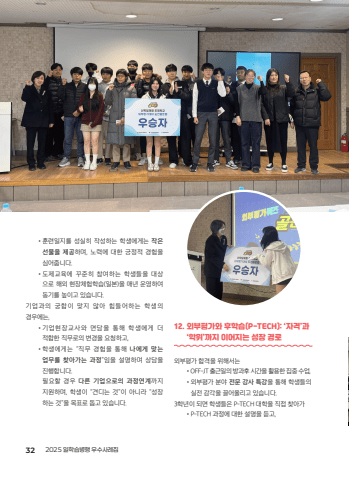 %u2022%ud6c8%ub828%uc77c%uc9c0%ub97c %uc131%uc2e4%ud788 %uc791%uc131%ud558%ub294 %ud559%uc0dd%uc5d0%uac8c%ub294 %uc791%uc740 %uc120%ubb3c%uc744 %uc81c%uacf5%ud558%uba70, %ub178%ub825%uc5d0 %ub300%ud55c %uae0d%uc815%uc801 %uacbd%ud5d8%uc744%uc2ec%uc5b4%uc90d%ub2c8%ub2e4.%u2022%ub3c4%uc81c%uad50%uc721%uc5d0 %uafb8%uc900%ud788 %ucc38%uc5ec%ud558%ub294 %ud559%uc0dd%ub4e4%uc744 %ub300%uc0c1%uc73c%ub85c %ud574%uc678 %ud604%uc7a5%uccb4%ud5d8%ud559%uc2b5(%uc77c%ubcf8)%uc744 %ub9e4%ub144 %uc6b4%uc601%ud558%uc5ec%ub3d9%uae30%ub97c %ub192%uc774%uace0 %uc788%uc2b5%ub2c8%ub2e4.%uae30%uc5c5%uacfc%uc758 %uad81%ud569%uc774 %ub9de%uc9c0 %uc54a%uc544 %ud798%ub4e4%uc5b4%ud558%ub294 %ud559%uc0dd%uc758%uacbd%uc6b0%uc5d0%ub294,%u2022%uae30%uc5c5%ud604%uc7a5%uad50%uc0ac%uc640 %uba74%ub2f4%uc744 %ud1b5%ud574 %ud559%uc0dd%uc5d0%uac8c %ub354%uc801%ud569%ud55c %uc9c1%ubb34%ub85c%uc758 %ubcc0%uacbd%uc744 %uc694%uccad%ud558%uace0,%u2022%ud559%uc0dd%uc5d0%uac8c%ub294 %u201c%uc9c1%ubb34 %uacbd%ud5d8%uc744 %ud1b5%ud574 %ub098%uc5d0%uac8c %ub9de%ub294 %uc5c5%ubb34%ub97c %ucc3e%uc544%uac00%ub294 %uacfc%uc815%u201d%uc784%uc744 %uc124%uba85%ud558%uba70 %uc0c1%ub2f4%uc744%uc9c4%ud589%ud569%ub2c8%ub2e4.%u0009%ud544%uc694%ud560 %uacbd%uc6b0 %ub2e4%ub978 %uae30%uc5c5%uc73c%ub85c%uc758 %uacfc%uc815%uc5f0%uacc4%uae4c%uc9c0%uc9c0%uc6d0%ud558%uba70, %ud559%uc0dd%uc774 %u201c%uacac%ub514%ub294 %uac83%u201d%uc774 %uc544%ub2c8%ub77c %u201c%uc131%uc7a5%ud558%ub294 %uac83%u201d%uc744 %ubaa9%ud45c%ub85c %ub3d5%uace0 %uc788%uc2b5%ub2c8%ub2e4.12. %uc678%ubd80%ud3c9%uac00%uc640 %ud6c4%ud559%uc2b5(P-TECH): %u2018%uc790%uaca9%u2019%uacfc %u2018%ud559%uc704%u2019%uae4c%uc9c0 %uc774%uc5b4%uc9c0%ub294 %uc131%uc7a5 %uacbd%ub85c%uc678%ubd80%ud3c9%uac00 %ud569%uaca9%uc744 %uc704%ud574%uc11c%ub294%u2022OFF-JT %ucd9c%uadfc%uc77c%uc758 %ubc29%uacfc%ud6c4 %uc2dc%uac04%uc744 %ud65c%uc6a9%ud55c %uc9d1%uc911 %uc218%uc5c5,%u2022%uc678%ubd80%ud3c9%uac00 %ubd84%uc57c %uc804%ubb38 %uac15%uc0ac %ud2b9%uac15%uc744 %ud1b5%ud574 %ud559%uc0dd%ub4e4%uc758%uc2e4%uc804 %uac10%uac01%uc744 %ub04c%uc5b4%uc62c%ub9ac%uace0 %uc788%uc2b5%ub2c8%ub2e4.3%ud559%ub144%uc774 %ub418%uba74 %ud559%uc0dd%ub4e4%uc740 P-TECH %ub300%ud559%uc744 %uc9c1%uc811 %ucc3e%uc544%uac00%u2022P-TECH %uacfc%uc815%uc5d0 %ub300%ud55c %uc124%uba85%uc744 %ub4e3%uace0,32 2025 %uc77c%ud559%uc2b5%ubcd1%ud589 %uc6b0%uc218%uc0ac%ub840%uc9d1%uace0%uad50%uc77c%ud559%uc2b5%ubcd1%ud589 %uc6b0%uc218%uc0ac%ub840%uc9d1_1223.indd 32 2025. 12. 24. %uc624%uc804 11:40