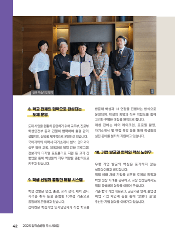 %uc2e0%uaddc %ud559%uc2b5%uae30%uc5c5 %ud611%uc57d8. %ud559%uad50 %uc804%uccb4%uc758 %ud611%ub825%uc73c%ub85c %uc644%uc131%ub418%ub294 %ub3c4%uc81c %uc6b4%uc601%ub3c4%uc81c %uc0ac%uc5c5%uc744 %uc6d0%ud65c%ud788 %uc6b4%uc601%ud558%uae30 %uc704%ud574 %uad50%ubb34%ubd80, %uc9c4%ub85c%ubd80,%ud559%uc0dd%uc548%uc804%ubd80 %ub4f1%uacfc %uae34%ubc00%ud788 %ud611%ub825%ud558%uc5ec %ucd9c%uacb0 %uad00%ub9ac,%uc0dd%ud65c%uc9c0%ub3c4, %uc0c1%ub2f4%uc744 %uccb4%uacc4%uc801%uc73c%ub85c %uc6b4%uc601%ud558%uace0 %uc788%uc2b5%ub2c8%ub2e4.%uad6d%uc5b4%uacfc%uc640%uc758 %uc774%ub825%uc11c%u00b7%uc790%uae30%uc18c%uac1c%uc11c %ucca8%uc0ad, %uc601%uc5b4%uacfc%uc758%uc2e4%ubb34 %uc601%uc5b4 %uad50%uc721, %uccb4%uc721%uacfc%uc758 %uccb4%ub825 %uac15%ud654 %ud504%ub85c%uadf8%ub7a8,%uc815%ubcf4%uacfc%uc758 %ub514%uc9c0%ud138 %ud3ec%ud2b8%ud3f4%ub9ac%uc624 %uc9c0%uc6d0 %ub4f1 %uad50%uacfc %uac04%ud611%uc5c5%uc744 %ud1b5%ud574 %ud559%uc0dd%ub4e4%uc758 %uc9c1%ubb34 %uc5ed%ub7c9%uc744 %uc885%ud569%uc801%uc73c%ub85c%ud0a4%uc6b0%uace0 %uc788%uc2b5%ub2c8%ub2e4.9. %ud559%uc0dd %uc120%ubc1c%uacfc %uacf5%uc815%ud55c %ub9e4%uce6d %uc2dc%uc2a4%ud15c%ud559%uc0dd %uc120%ubc1c%uc740 %uba74%uc811, %ucd9c%uacb0, %uad50%uacfc %uc131%uc801, %uccb4%ub825 %uac80%uc0ac,%uc790%uaca9%uc99d %ucde8%ub4dd %ub4f1%uc744 %uc885%ud569%ud55c 100%uc810 %uae30%uc900%uc73c%ub85c%uacf5%uc815%ud558%uac8c %uc6b4%uc601%ud558%uace0 %uc788%uc2b5%ub2c8%ub2e4.%uc7a1%ub9c8%ucf13%uc740 %ud559%uc2b5%uae30%uc5c5 %uc778%uc0ac%ub2f4%ub2f9%uc790%uac00 %uc9c1%uc811 %ud559%uad50%ub97c%ubc29%ubb38%ud574 %ud559%uc0dd%uacfc 1:1 %uba74%uc811%uc744 %uc9c4%ud589%ud558%ub294 %ubc29%uc2dd%uc73c%ub85c%uc6b4%uc601%ub418%uba70, %ud559%uc0dd%uc758 %ud76c%ub9dd%uacfc %uc9c1%ubb34 %uc801%ud569%ub3c4%ub97c %ud568%uaed8%uace0%ub824%ud55c %ud22c%uba85%ud55c %ub9e4%uce6d%uc744 %uc6d0%uce59%uc73c%ub85c %ud569%ub2c8%ub2e4.%ub9e4%uce6d %uc804%uc5d0%ub294 %ud5e4%uc5b4%u00b7%uba54%uc774%ud06c%uc5c5, %ud504%ub85c%ud544 %ucd2c%uc601,%uc790%uae30%uc18c%uac1c%uc11c %ubc0f %uba74%uc811 %ud2b9%uac15 %ub4f1%uc744 %ud1b5%ud574 %ud559%uc0dd%ub4e4%uc758%uc2e4%uc804 %uc900%ube44%ub97c %ucca0%uc800%ud788 %uc9c0%uc6d0%ud558%uace0 %uc788%uc2b5%ub2c8%ub2e4.10. %uae30%uc5c5 %ubc1c%uad74%uacfc %ud611%ub825%uc758 %ud575%uc2ec %ub178%ud558%uc6b0%uc6b0%ub7c9 %uae30%uc5c5 %ubc1c%uad74%uc758 %ud575%uc2ec%uc740 %ud3ec%uae30%ud558%uc9c0 %uc54a%ub294%uc124%ub4dd%ub825%uc774%ub77c%uace0 %uc0dd%uac01%ud569%ub2c8%ub2e4.%uc9c1%uc811 %uc5ec%ub7ec %ucc28%ub840 %uae30%uc5c5%uc744 %ubc29%ubb38%ud574 %ub3c4%uc81c%uc758 %uc7a5%uc810%uacfc%ud559%uc0dd %uc131%uc7a5 %uc0ac%ub840%ub97c %uacf5%uc720%ud558%uace0, %uad50%uc7a5 %uc120%uc0dd%ub2d8%uaed8%uc11c%ub3c4%uc9c1%uc811 %ub3d9%ud589%ud558%uba70 %ud611%uc57d%uc744 %uc774%ub04c%uc5b4 %uc8fc%uc2ed%ub2c8%ub2e4.%uae30%uc874 %ud611%uc57d %uae30%uc5c5 %ub124%ud2b8%uc6cc%ud06c, %uacf5%uacf5%uae30%uad00 %uc5f0%uacc4, %uc878%uc5c5%uc0dd%ucde8%uc5c5 %uae30%uc5c5 %uc7ac%uc5f0%uacc4 %ub4f1%uc744 %ud1b5%ud574 %u2018%uc591%ubcf4%ub2e4 %uc9c8%u2019%uc744%uc6b0%uc120%ud55c %uae30%uc5c5 %ud611%ub825%uc744 %uc774%uc5b4%uac00%uace0 %uc788%uc2b5%ub2c8%ub2e4.42 2025 %uc77c%ud559%uc2b5%ubcd1%ud589 %uc6b0%uc218%uc0ac%ub840%uc9d1%uace0%uad50%uc77c%ud559%uc2b5%ubcd1%ud589 %uc6b0%uc218%uc0ac%ub840%uc9d1_1223.indd 42 2025. 12. 24. %uc624%uc804 11:40