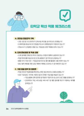 %ud0c0%ud559%uad50 %ud655%uc0b0 %uc801%uc6a9 %uccb4%ud06c%ub9ac%uc2a4%ud2b8A. %ub9ac%ub354%uc2ed%u00b7%uc804%ub2f4%uc870%uc9c1 %uad6c%ucd95%u2022%uad50%uc7a5%u00b7%uad50%uac10 %ub4f1 1%uc120 %uad00%ub9ac%uc790%uac00 %ub3c4%uc81c%uc0ac%uc5c5 %ucd94%uc9c4%uc744 %uacf5%uc2dd%uc801%uc73c%ub85c %uc120%uc5b8%ud588%ub294%uac00?%u2022%ub3c4%uc81c%ubd80%uc7a5%uc744 %uc911%uc2ec%uc73c%ub85c %ud55c %uc804%ub2f4%ud300(%uc9c0%ub3c4%uad50%uc0ac%u00b7%ud589%uc815%ub2f4%ub2f9)%uc774 %uc9c0%uc815%ub418%uc5b4 %uc788%ub294%uac00?%u2022%uc804%ub2f4%uad50%uc0ac%uac00 %uc0b0%uc5c5%ud604%uc7a5 %uacbd%ud5d8 %ub610%ub294 %uc9c1%uc5c5%uc0c1%ub2f4 %uad00%ub828 %uc5ed%ub7c9%uc744 %uac16%ucd94%uace0 %uc788%ub294%uac00?B. %ub3c4%uc81c %uc900%ube44%uacfc%uc815 %ubc0f %ud559%uc0dd %uc120%ubc1c%u2022%ub3c4%uc81c %ucc38%uc5ec%ub97c %uc804%uc81c%ub85c %ud55c %ud559%uacfc%u00b7%uc804%uacf5(%ub610%ub294 %uacfc%uc815)%uc774 %uba85%ud655%ud788 %uc124%uc815%ub418%uc5b4 %uc788%ub294%uac00?%u2022%ud559%uc0dd%u00b7%ud559%ubd80%ubaa8%ub97c %ub300%uc0c1%uc73c%ub85c %ud55c %ub3c4%uc81c %uc124%uba85%ud68c%uac00 %uc815%uae30%uc801%uc73c%ub85c %uc6b4%uc601%ub418%ub294%uac00?%u2022%ucd9c%uacb0%u00b7%uc758%uc9c0%u00b7%uac00%uc815 %uc758%uacac + %uc9c1%uc5c5%uc2ec%ub9ac%uac80%uc0ac(%uc778%uc131%u00b7%ud765%ubbf8)%ub97c %ud65c%uc6a9%ud55c %uc120%ubc1c %uccb4%uacc4%uac00 %uc788%ub294%uac00?%u2022%uc911%ub3c4 %ud0c8%ub77d %uc608%ubc29%uc744 %uc704%ud55c %uc0c1%ub2f4%u00b7%uc7ac%ubc30%uce58%u00b7%uc7ac%ub9e4%uce6d %ud504%ub85c%uc138%uc2a4%uac00 %ubb38%uc11c%ud654%ub418%uc5b4 %uc788%ub294%uac00?C. %uae30%uc5c5 %ubc1c%uad74%u00b7%ud611%uc57d %ubc0f %uc7a1%ub9c8%ucf13%u2022%ud559%uc0dd %uc548%uc804%uacfc %uc791%uc5c5%ud658%uacbd%uc744 %ud655%uc778%ud558%ub294 %ud604%uc7a5 %uc810%uac80 %uccb4%ud06c%ub9ac%uc2a4%ud2b8%ub97c %ubcf4%uc720%ud588%ub294%uac00?%u2022%uc720%uad00 %uae30%uad00(%uacf5%ub2e8, %uc9c0%uc790%uccb4, %uc9c0%uc6d0%ub2e8 %ub4f1)%uacfc %uc5f0%uacc4%ud55c %uae30%uc5c5 %ubc1c%uad74 %ucc44%ub110%uc774 %uc788%ub294%uac00?%u2022%uae30%uc5c5 %uc124%uba85%ud68c%u00b7%uacac%ud559%u00b7%uc7a1%ub9c8%ucf13 %ub4f1 %ud559%uc0dd%uacfc %uae30%uc5c5%uc774 %ub9cc%ub098%ub294 %uacf5%uc2dd %ud504%ub85c%uadf8%ub7a8%uc744 %uc6b4%uc601%ud558%ub294%uac00?%u2022%uadfc%ub85c%uacc4%uc57d%uc11c %uc791%uc131, 4%ub300 %ubcf4%ud5d8, HRD-NET %ub4f1 %ud589%uc815 %uc808%ucc28%ub97c %ud559%uad50%uac00 %uc9c0%uc6d0%ud558%ub294 %uccb4%uacc4%ub97c%uac16%ucd94%uc5c8%ub294%uac00?54 2025 %uc77c%ud559%uc2b5%ubcd1%ud589 %uc6b0%uc218%uc0ac%ub840%uc9d1%uace0%uad50%uc77c%ud559%uc2b5%ubcd1%ud589 %uc6b0%uc218%uc0ac%ub840%uc9d1_1223.indd 54 2025. 12. 24. %uc624%uc804 11:40