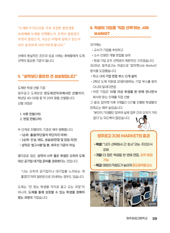 %u201c%ub3c4%uc81c%uc640 P-TECH%uc744 %uac70%uccd0 %uc131%uc7a5%ud55c %uc878%uc5c5%uc0dd%uc744 %ucd08%uccad%ud574%uc65c %ub3c4%uc81c%ub97c %uc120%ud0dd%ud588%ub294%uc9c0, %ubb34%uc5c7%uc774 %ud798%ub4e4%uc5c8%uace0 %ubb34%uc5c7%uc774 %uc88b%uc558%ub294%uc9c0, %uc9c0%uae08%uc740 %uc5b4%ub5bb%uac8c %uc77c%ud558%uace0 %uc788%ub294%uc9c0 %uc544%uc8fc %uc194%uc9c1%ud558%uac8c %uc774%uc57c%uae30%ud558%uac8c %ud569%ub2c8%ub2e4.%u201d%uc120%ubc30%uc758 %ud604%uc2e4%uc801%uc778 %uc870%uc5b8%uacfc %uc131%uacf5 %uc0ac%ub840%ub294 %ud6c4%ubc30%ub4e4%uc5d0%uac8c %ub3c4%uc81c%uc120%ud0dd%uc758 %uc911%uc694%ud55c %uae30%uc900%uc774 %ub429%ub2c8%ub2e4.5. %u201c%uc131%uc801%ubcf4%ub2e4 %uc911%uc694%ud55c %uac74 %uc131%uc2e4%ud568%uc785%ub2c8%ub2e4%u201d%ub3c4%uc81c%ubc18 %ud559%uc0dd %uc120%ubc1c %uae30%uc900%uccad%uc8fc%uacf5%uace0 %ub3c4%uc81c%ubc18%uc740 %ubc18%ub3c4%uccb4%uc804%uc790%uacfc%uc5d0%uc11c%ub9cc %uc120%ubc1c%ud558%uba70,%ud559%ub144%ub2f9 40~50%uba85 %uc911 %uc57d 20%uc5ec %uba85%uc744 %uc120%ubc1c%ud569%ub2c8%ub2e4.%uc120%ubc1c %uacfc%uc815%uc7401. %uc11c%ub958 %uc804%ud615(1%ucc28)2. %uba74%uc811 %uc804%ud615(2%ucc28)%ub450 %ub2e8%uacc4%ub85c %uc9c4%ud589%ub418%uba70, %uae30%uc900%uc740 %ub9e4%uc6b0 %uba85%ud655%ud569%ub2c8%ub2e4.%u20221%uc21c%uc704: %ucd9c%uacb0(%ubb34%ub2e8%uacb0%uc11d%u00b7%ubb34%ub2e8%uc9c0%uac01 %uc5ec%ubd80)%u20222%uc21c%uc704: %uc778%uc131, %ud0dc%ub3c4, %uc131%uc2e4%uc131(%uba74%uc811 %ubc0f %ub2f4%uc784 %uc758%uacac)%u2022%uc131%uc801%uc740 %u2018%ucc38%uace0%uc0ac%ud56d%u2019%uc77c %ubfd0, %ucd5c%uc6b0%uc120 %uae30%uc900%uc774 %uc544%ub2d8%ud765%ubbf8%ub85c%uc6b4 %uc810%uc740, %uc131%uc801%uc774 %ub108%ubb34 %uc88b%uc740 %ud559%uc0dd%uc740 %uc624%ud788%ub824 %ub3c4%uc81c %ub300%uc2e0 %uacf5%uae30%uc5c5%u00b7%ub300%uae30%uc5c5 %uc900%ube44%ub97c %uad8c%uc720%ud55c%ub2e4%ub294 %uac83%uc785%ub2c8%ub2e4.%u201c%ub108%ub294 %uc624%ud788%ub824 %uacf5%uae30%uc5c5%uc774%ub098 %ub300%uae30%uc5c5%uc744 %ub178%ub824%ubcf4%ub294 %uac8c%uc88b%uaca0%ub2e4%u201d%ub77c%uba70 %uc77c%ubc18%ubc18%uc73c%ub85c %uc548%ub0b4%ud558%ub294 %uacbd%uc6b0%ub3c4 %uc788%uc2b5%ub2c8%ub2e4.%ub3c4%uc81c%ub294 %u201c%uc548 %ub9de%ub294 %ud559%uc0dd%uc744 %uc5b5%uc9c0%ub85c %ub04c%uace0 %uc624%ub294 %uacfc%uc815%u201d%uc774%uc544%ub2c8%ub77c, %ub3c4%uc81c%ub97c %ud1b5%ud574 %uc131%uc7a5%ud560 %uc218 %uc788%ub294 %ud559%uc0dd%uc744 %uc815%ud655%ud788 %ucc3e%ub294 %uacfc%uc815%uc5d0 %uac00%uae5d%uc2b5%ub2c8%ub2e4.6. %ud559%uc0dd%uc774 %uae30%uc5c5%uc744 %u2018%uc9c1%uc811 %uc120%ud0dd%u2019%ud558%ub294 JOB MARKET%uacfc%uac70%uc5d0%ub294%u2022%uad50%uc0ac%uac00 %uae30%uc5c5%uc744 %ucd94%ucc9c%ud558%uace0%u2022%uc18c%uc218 %uc778%uc6d0%ub9cc %uac1c%ubcc4 %uba74%uc811%uc744 %ubcf4%uba70%u2022%ud559%uc0dd%u00b7%uae30%uc5c5 %ubaa8%ub450 %uc120%ud0dd%uad8c%uc774 %uc81c%ud55c%uc801%uc778 %uad6c%uc870%uc600%uc2b5%ub2c8%ub2e4.2025%ub144, %uccad%uc8fc%uacf5%uace0%ub294 %ucc98%uc74c%uc73c%ub85c %u2018%uc7a1%ub9c8%ucf13(Job Market)%u2019%ubc29%uc2dd%uc744 %ub3c4%uc785%ud588%uc2b5%ub2c8%ub2e4.%u2022%ud559%uad50 %ub0b4%uc5d0 %uae30%uc5c5 %uba74%uc811 %ubd80%uc2a4 12%uac1c %uc124%uce58%u20222%ud559%ub144 %ub3c4%uc81c %uc9c0%uc6d0%uc0dd 20%uba85%uc774%uc6d0%ud558%ub294 %uae30%uc5c5 %ubd80%uc2a4%ub97c %ucc3e%uc544%ub2e4%ub2c8%uba70 %uc77c%ub300%ub2e4%uba74%uc811%u2022%uc5b4%ub5a4 %uae30%uc5c5%uc740 10%uba85 %uc774%uc0c1 %ud559%uc0dd%uc744 %ud55c %ubc88%uc5d0 %ub9cc%ub098%uba74%uc11c%ud68c%uc0ac%uc640 %ub9de%ub294 %uc778%uc7ac%ub97c %uc9c1%uc811 %uc120%ubc1c%uadf8 %uacb0%uacfc, %uc7a1%ub9c8%ucf13 %uc774%ud6c4 3%uac1c%uc6d4%uac04 OJT%ub97c %uc9c4%ud589%ud55c %ud559%uc0dd%ub4e4%uc758%ub9cc%uc871%ub3c4%ub294 %ub9e4%uc6b0 %ub192%uc558%uc2b5%ub2c8%ub2e4.%u201c%ubcf8%uc778%uc774 %uae30%ub300%ud588%ub358 %uc5c5%ubb34%uc640 %uc2e4%uc81c %uc5c5%ubb34 %uac04%uc758 %uc624%ucc28%uac00 %uac70%uc758%uc5c6%ub2e4%u201d%ub294 %ud53c%ub4dc%ubc31%uc774 %ub9ce%uc558%uc2b5%ub2c8%ub2e4.%uccad%uc8fc%uacf5%uace0 JOB MARKET%uc758 %ud6a8%uacfc%u2022 %ud559%uc0dd: %u201c%ub0b4%uac00 %uc120%ud0dd%ud574%uc11c %uac04 %ud68c%uc0ac%u201d%ub77c%ub294 %uc8fc%uc778%uc758%uc2dd %uac15%ud654%u2022 %uae30%uc5c5: %ub354 %ub9ce%uc740 %ud559%uc0dd%uc744 %ud55c %ubc88%uc5d0 %uba74%uc811, %ucd5c%uc801 %ub9e4%uce6d %uac00%ub2a5%u2022 %ud559%uad50: %ub9e4%uce6d%uc758 %uc801%ud569%ub3c4%uac00 %ub192%uc544%uc838 %uc911%ub3c4%ud0c8%ub77d%ub960 %uac10%uc18c%uc7a1%ub9c8%ucf13%uccad%uc8fc%uacf5%uc5c5%uace0%ub4f1%ud559%uad50 59%uace0%uad50%uc77c%ud559%uc2b5%ubcd1%ud589 %uc6b0%uc218%uc0ac%ub840%uc9d1_1223.indd 59 2025. 12. 24. %uc624%uc804 11:40