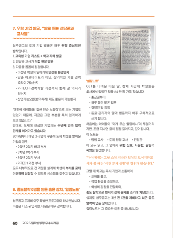 7. %uc6b0%ub7c9 %uae30%uc5c5 %ubc1c%uad74, %u201c%ubc1c%ub85c %ub6f0%ub294 %uc804%ub2f4%uad00%uacfc %uad50%uc0ac%ub4e4%u201d%uccad%uc8fc%uacf5%uace0%uc758 %ub3c4%uc81c %uae30%uc5c5 %ubc1c%uad74%uc740 %ub9e4%uc6b0 %ud604%uc7a5 %uc911%uc2ec%uc801%uc778 %ubc29%uc2dd%uc785%ub2c8%ub2e4.1. %uad50%uc721%uccad %uae30%uc5c5 %ub9ac%uc2a4%ud2b8 + %ud559%uad50 %uc790%uccb4 %ubc1c%uad742. %uc804%ub2f4%uad00%u00b7%uad50%uc0ac%uac00 %uc9c1%uc811 %ud604%uc7a5 %ubc29%ubb383. %ub2e4%uc74c%uc744 %uaf3c%uaf3c%ud788 %uc810%uac80%ud569%ub2c8%ub2e4.%u2022%u200c %u200c %ubbf8%uc131%ub144 %ud559%uc0dd%uc774 %uc77c%ud558%uae30%uc5d0 %uc548%uc804%ud55c %ud658%uacbd%uc778%uc9c0%u2022%ub2e8%uc21c %uc544%ub974%ubc14%uc774%ud2b8%uac00 %uc544%ub2cc, %uc7a5%uae30%uc801%uc778 %uae30%uc220%u00b7%uacbd%ub825%ucd95%uc801%uc774 %uac00%ub2a5%ud55c%uc9c0%u2022P-TECH%u00b7%uacbd%ub825%uac1c%ubc1c %uacfc%uc815%uae4c%uc9c0 %ud568%uaed8 %uac08 %uc758%uc9c0%uac00%uc788%ub294%uc9c0%u2022%uc0b0%uc5c5%uae30%ub2a5%uc694%uc6d0(%ubcd1%uc5ed%ud2b9%ub840) %uc81c%ub3c4 %ud65c%uc6a9%uc774 %uac00%ub2a5%ud55c%uc9c0%u201c%uc608%uc804%uc5d0 %uc544%uc774%ub4e4%uc744 %u2018%uac12%uc2fc %ub2e8%uc21c %ub178%ub3d9%ub825%u2019%uc73c%ub85c %ubcf4%ub294 %uae30%uc5c5%ub3c4%uc788%uc5c8%uae30 %ub54c%ubb38%uc5d0, %uc9c0%uae08%uc740 %uadf8%ub7f0 %ubd80%ubd84%uc744 %ud2b9%ud788 %uc5c4%uaca9%ud558%uac8c%ubcf4%uace0 %uc788%uc2b5%ub2c8%ub2e4.%u201d%ubc18%ub300%ub85c, %ub3c4%uc81c%uc5d0 %uc9c4%uc2ec%uc778 %uae30%uc5c5%uacfc%ub294 %uc218%ub144%uc9f8 %uc5f0%uc18d %ud611%ub825 %uad00%uacc4%ub97c %uc774%uc5b4%uac00%uace0 %uc788%uc2b5%ub2c8%ub2e4.2017%ub144%ubd80%ud130 %ub9e4%ub144 2~3%uba85%uc529 %uafb8%uc900%ud788 %ub3c4%uc81c %ud559%uc0dd%uc744 %ubc1b%uc544%uc628%uae30%uc5c5%uc758 %uacbd%uc6b0,%u20222%ud559%ub144 2%ud559%uae30 %ubc30%uce58 %ubd80%uc11c%u20223%ud559%ub144 1%ud559%uae30 %ubd80%uc11c%u20223%ud559%ub144 2%ud559%uae30 %ubd80%uc11c%u2022P-TECH %uacfc%uc815 %ubd80%uc11c%ubaa8%ub450 %ub0b4%ubd80%uc801%uc73c%ub85c %uc804 %uacfc%uc815%uc744 %uc124%uacc4%ud574 %ud559%uc0dd%uc774 %ubd80%uc11c%ub97c %ub85c%ud14c%uc774%uc158%ud558%uba70 %uc131%uc7a5%ud560 %uc218 %uc788%ub3c4%ub85d %uc2dc%uc2a4%ud15c%uc744 %uac16%ucd94%uace0 %uc788%uc2b5%ub2c8%ub2e4.8. %uc911%ub3c4%ud0c8%ub77d 0%uba85%uc744 %ub9cc%ub4e0 %uc228%uc740 %uc7a5%uce58, %u2018%ud790%ub9c1%ub178%ud2b8%u2019%uccad%uc8fc%uacf5%uace0 %ub3c4%uc81c%uc758 %uc544%uc8fc %ud2b9%ubcc4%ud55c %ud504%ub85c%uadf8%ub7a8%uc774 %ud558%ub098 %uc788%uc2b5%ub2c8%ub2e4.%uc774%ub984%uc740 %ub2e4%uc18c %uadc0%uc5fd%uc9c0%ub9cc, %ub0b4%uc6a9%uc740 %ub9e4%uc6b0 %uac15%ub825%ud569%ub2c8%ub2e4.%u2018%ud790%ub9c1%ub178%ud2b8%u2019OJT%ub97c %ub2e4%ub140%uc628 %ub2e4%uc74c %ub0a0, %ucc3d%uccb4 %uc2dc%uac04%uc5d0 %ud559%uc0dd%ub4e4%uc740%ud68c%uc0ac%uc5d0%uc11c %uc788%uc5c8%ub358 %uc77c%uc744 A4 %ud55c %uc7a5 %uac00%ub4dd %uc801%uc2b5%ub2c8%ub2e4.%u2022%u200c %u200c%ucd9c%uadfc%uae38%ubd80%ud130%u2022%u200c %u200c%ud558%ub8e8 %ub3d9%uc548 %ub9e1%uc740 %uc5c5%ubb34%u2022%u200c %u200c%uacaa%uc5c8%ub358 %uc77c%u00b7%uac10%uc815%u2022%ub3d9%ub8cc%u00b7%uad00%ub9ac%uc790%uc758 %ub9d0%uacfc %ud589%ub3d9%uae4c%uc9c0 %uc544%uc8fc %uad6c%uccb4%uc801%uc73c%ub85c%uc4f0%uac8c %ud569%ub2c8%ub2e4.%ucc98%uc74c%uc5d0%ub294 %uc544%uc774%ub4e4%uc774 %u201c%uc774%uac8c %ubb34%uc2a8 %ud790%ub9c1%uc774%ub0d0%u201d%uba70 %ud22c%ub35c%uac70%ub9ac%uc9c0%ub9cc, %uc870%uae08 %uc9c0%ub098%uba74 %uae00%uc774 %uc810%uc810 %uae38%uc5b4%uc9c0%uace0, %uae4a%uc5b4%uc9d1%ub2c8%ub2e4.%uc774 %ub178%ud2b8%ub294%u2022%ub2f4%uc784 %uad50%uc0ac %u2022%ub3c4%uc81c %ub2f4%ub2f9 %uad50%uc0ac %u2022%uc804%ub2f4%uad00%uc774 %ubaa8%ub450 %uc77d%uace0, %uadf8 %uc548%uc5d0%uc11c %uc704%ud5d8 %uc2e0%ud638, %uc11c%uc6b4%ud568, %uac08%ub4f1%uc758 %uc528%uc557%uc744 %ubc1c%uacac%ud569%ub2c8%ub2e4.%u201c%uc544%uc774%uc5d0%uac8c%ub294 %uadf8%ub0e5 %uc2a4%uccd0 %uc9c0%ub098%uac04 %uc77c%ucc98%ub7fc %ubcf4%uc774%uc9c0%ub9cc%uad50%uc0ac%uac00 %ubcfc %ub54c%ub294 %u2018%uc774%uac74 %ubb38%uc81c %uc0c1%ud669%u2019%uc778 %uacbd%uc6b0%uac00 %uc788%uc2b5%ub2c8%ub2e4.%u201d%uadf8%ub7f4 %ub54c %ud559%uad50%ub294 %uc989%uc2dc %uae30%uc5c5%uacfc %uc18c%ud1b5%ud558%uc5ec%u2022%uc624%ud574%ub97c %ud480%uace0,%u2022%uc791%uc5c5 %ud658%uacbd%uc744 %uc870%uc815%ud558%uace0,%u2022%ud559%uc0dd%uc758 %uac10%uc815%uc744 %uc804%ub2ec%ud558%uba70,%uc911%ub3c4 %ud0c8%ub77d%uc73c%ub85c %ubc88%uc9c0%uae30 %uc804%uc5d0 %ubb38%uc81c%ub97c %uc870%uae30%uc5d0 %ucc28%ub2e8%ud569%ub2c8%ub2e4.%uc2e4%uc81c%ub85c %uccad%uc8fc%uacf5%uace0%ub294 3%ub144 %uc804 1%uac74%uc744 %uc81c%uc678%ud558%uace0 %ucd5c%uadfc %uc911%ub3c4 %ud0c8%ub77d%uc774 %uc5c6%ub294 %uc0c1%ud0dc%uc785%ub2c8%ub2e4.%ud790%ub9c1%ub178%ud2b8%ub294 %uadf8 %uc911%uc694%ud55c %uc774%uc720 %uc911 %ud558%ub098%uc785%ub2c8%ub2e4.60 2025 %uc77c%ud559%uc2b5%ubcd1%ud589 %uc6b0%uc218%uc0ac%ub840%uc9d1%uace0%uad50%uc77c%ud559%uc2b5%ubcd1%ud589 %uc6b0%uc218%uc0ac%ub840%uc9d1_1223.indd 60 2025. 12. 24. %uc624%uc804 11:40