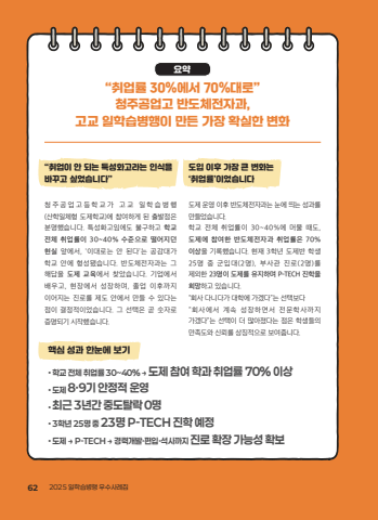 %u201c%ucde8%uc5c5%ub960 30%%uc5d0%uc11c 70%%ub300%ub85c%u201d%uccad%uc8fc%uacf5%uc5c5%uace0 %ubc18%ub3c4%uccb4%uc804%uc790%uacfc,%uace0%uad50 %uc77c%ud559%uc2b5%ubcd1%ud589%uc774 %ub9cc%ub4e0 %uac00%uc7a5 %ud655%uc2e4%ud55c %ubcc0%ud654%uc694%uc57d%ud575%uc2ec %uc131%uacfc %ud55c%ub208%uc5d0 %ubcf4%uae30%u201c%ucde8%uc5c5%uc774 %uc548 %ub418%ub294 %ud2b9%uc131%ud654%uace0%ub77c%ub294 %uc778%uc2dd%uc744 %ubc14%uafb8%uace0 %uc2f6%uc5c8%uc2b5%ub2c8%ub2e4%u201d%uccad%uc8fc%uacf5%uc5c5%uace0%ub4f1%ud559%uad50%uac00 %uace0 %uad50 %uc77c%ud559%uc2b5%ubcd1%ud589(%uc0b0%ud559%uc77c%uccb4%ud615 %ub3c4%uc81c%ud559%uad50)%uc5d0 %ucc38%uc5ec%ud558%uac8c %ub41c %ucd9c%ubc1c%uc810%uc740%ubd84%uba85%ud588%uc2b5%ub2c8%ub2e4. %ud2b9%uc131%ud654%uace0%uc784%uc5d0%ub3c4 %ubd88%uad6c%ud558%uace0 %ud559%uad50 %uc804%uccb4 %ucde8%uc5c5%ub960%uc774 30~40% %uc218%uc900%uc73c%ub85c %ub5a8%uc5b4%uc9c0%ub358 %ud604%uc2e4 %uc55e%uc5d0%uc11c, %u2018%uc774%ub300%ub85c%ub294 %uc548 %ub41c%ub2e4%u2019%ub294 %uacf5%uac10%ub300%uac00%ud559%uad50 %uc548%uc5d0 %ud615%uc131%ub410%uc2b5%ub2c8%ub2e4. %ubc18%ub3c4%uccb4%uc804%uc790%uacfc%ub294 %uadf8%ud574%ub2f5%uc744 %ub3c4%uc81c %uad50%uc721%uc5d0%uc11c %ucc3e%uc558%uc2b5%ub2c8%ub2e4. %uae30%uc5c5%uc5d0%uc11c%ubc30%uc6b0%uace0, %ud604%uc7a5%uc5d0%uc11c %uc131%uc7a5%ud558%uba70, %uc878%uc5c5 %uc774%ud6c4%uae4c%uc9c0%uc774%uc5b4%uc9c0%ub294 %uc9c4%ub85c%ub97c %uc81c%ub3c4 %uc548%uc5d0%uc11c %ub9cc%ub4e4 %uc218 %uc788%ub2e4%ub294%uc810%uc774 %uacb0%uc815%uc801%uc774%uc5c8%uc2b5%ub2c8%ub2e4. %uadf8 %uc120%ud0dd%uc740 %uace7 %uc22b%uc790%ub85c%uc99d%uba85%ub418%uae30 %uc2dc%uc791%ud588%uc2b5%ub2c8%ub2e4.%ub3c4%uc785 %uc774%ud6c4 %uac00%uc7a5 %ud070 %ubcc0%ud654%ub294 %u2018%ucde8%uc5c5%ub960%u2019%uc774%uc5c8%uc2b5%ub2c8%ub2e4%ub3c4%uc81c %uc6b4%uc601 %uc774%ud6c4 %ubc18%ub3c4%uccb4%uc804%uc790%uacfc%ub294 %ub208%uc5d0 %ub744%ub294 %uc131%uacfc%ub97c%ub9cc%ub4e4%uc5c8%uc2b5%ub2c8%ub2e4.%ud559%uad50 %uc804%uccb4 %ucde8%uc5c5%ub960%uc774 30~40%%uc5d0 %uba38%ubb3c %ub54c%ub3c4,%ub3c4%uc81c%uc5d0 %ucc38%uc5ec%ud55c %ubc18%ub3c4%uccb4%uc804%uc790%uacfc %ucde8%uc5c5%ub960%uc740 70% %uc774%uc0c1%uc744 %uae30%ub85d%ud588%uc2b5%ub2c8%ub2e4. %ud604%uc7ac 3%ud559%ub144 %ub3c4%uc81c%ubc18 %ud559%uc0dd25%uba85 %uc911 %uad70%uc785%ub300(2%uba85), %ubd80%uc0ac%uad00 %uc9c4%ub85c(2%uba85)%ub97c%uc81c%uc678%ud55c 23%uba85%uc774 %ub3c4%uc81c%ub97c %uc720%uc9c0%ud558%uba70 P-TECH %uc9c4%ud559%uc744 %ud76c%ub9dd%ud558%uace0 %uc788%uc2b5%ub2c8%ub2e4.%u201c%ud68c%uc0ac %ub2e4%ub2c8%ub2e4%uac00 %ub300%ud559%uc5d0 %uac00%uaca0%ub2e4%u201d%ub294 %uc120%ud0dd%ubcf4%ub2e4%u201c%ud68c%uc0ac%uc5d0%uc11c %uacc4%uc18d %uc131%uc7a5%ud558%uba74%uc11c %uc804%ubb38%ud559%uc0ac%uae4c%uc9c0%uac00%uaca0%ub2e4%u201d%ub294 %uc120%ud0dd%uc774 %ub354 %ub9ce%uc544%uc84c%ub2e4%ub294 %uc810%uc740 %ud559%uc0dd%ub4e4%uc758%ub9cc%uc871%ub3c4%uc640 %uc2e0%ub8b0%ub97c %uc0c1%uc9d5%uc801%uc73c%ub85c %ubcf4%uc5ec%uc90d%ub2c8%ub2e4.%u2022 %ud559%uad50 %uc804%uccb4 %ucde8%uc5c5%ub960 30~40% %u2192 %ub3c4%uc81c %ucc38%uc5ec %ud559%uacfc %ucde8%uc5c5%ub960 70% %uc774%uc0c1%u2022 %ub3c4%uc81c 8%u00b79%uae30 %uc548%uc815%uc801 %uc6b4%uc601%u2022 %ucd5c%uadfc 3%ub144%uac04 %uc911%ub3c4%ud0c8%ub77d 0%uba85%u2022 3%ud559%ub144 25%uba85 %uc911 23%uba85 P-TECH %uc9c4%ud559 %uc608%uc815%u2022 %ub3c4%uc81c %u2192 P-TECH %u2192 %uacbd%ub825%uac1c%ubc1c%u00b7%ud3b8%uc785%u00b7%uc11d%uc0ac%uae4c%uc9c0 %uc9c4%ub85c %ud655%uc7a5 %uac00%ub2a5%uc131 %ud655%ubcf462 2025 %uc77c%ud559%uc2b5%ubcd1%ud589 %uc6b0%uc218%uc0ac%ub840%uc9d1%uace0%uad50%uc77c%ud559%uc2b5%ubcd1%ud589 %uc6b0%uc218%uc0ac%ub840%uc9d1_1223.indd 62 2025. 12. 24. %uc624%uc804 11:40
