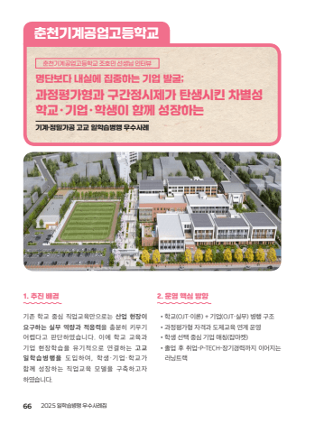 %ucd98%ucc9c%uae30%uacc4%uacf5%uc5c5%uace0%ub4f1%ud559%uad501. %ucd94%uc9c4 %ubc30%uacbd%uae30%uc874 %ud559%uad50 %uc911%uc2ec %uc9c1%uc5c5%uad50%uc721%ub9cc%uc73c%ub85c%ub294 %uc0b0%uc5c5 %ud604%uc7a5%uc774 %uc694%uad6c%ud558%ub294 %uc2e4%ubb34 %uc5ed%ub7c9%uacfc %uc801%uc751%ub825%uc744 %ucda9%ubd84%ud788 %ud0a4%uc6b0%uae30%uc5b4%ub835%ub2e4%uace0 %ud310%ub2e8%ud558%uc600%uc2b5%ub2c8%ub2e4. %uc774%uc5d0 %ud559%uad50 %uad50%uc721%uacfc%uae30%uc5c5 %ud604%uc7a5%ud559%uc2b5%uc744 %uc720%uae30%uc801%uc73c%ub85c %uc5f0%uacb0%ud558%ub294 %uace0%uad50 %uc77c%ud559%uc2b5%ubcd1%ud589%uc744 %ub3c4%uc785%ud558%uc5ec, %ud559%uc0dd%u00b7%uae30%uc5c5%u00b7%ud559%uad50%uac00%ud568%uaed8 %uc131%uc7a5%ud558%ub294 %uc9c1%uc5c5%uad50%uc721 %ubaa8%ub378%uc744 %uad6c%ucd95%ud558%uace0%uc790%ud558%uc600%uc2b5%ub2c8%ub2e4.2. %uc6b4%uc601 %ud575%uc2ec %ubc29%ud5a5%u2022%ud559%uad50(OJT%u00b7%uc774%ub860) + %uae30%uc5c5(OJT%u00b7%uc2e4%ubb34) %ubcd1%ud589 %uad6c%uc870%u2022%uacfc%uc815%ud3c9%uac00%ud615 %uc790%uaca9%uacfc %ub3c4%uc81c%uad50%uc721 %uc5f0%uacc4 %uc6b4%uc601%u2022%ud559%uc0dd %uc120%ud0dd %uc911%uc2ec %uae30%uc5c5 %ub9e4%uce6d(%uc7a1%ub9c8%ucf13)%u2022%uc878%uc5c5 %ud6c4 %ucde8%uc5c5%u2013P-TECH%u2013%uc7a5%uae30%uacbd%ub825%uae4c%uc9c0 %uc774%uc5b4%uc9c0%ub294%ub7ec%ub2dd%ud2b8%ub799%ucd98%ucc9c%uae30%uacc4%uacf5%uc5c5%uace0%ub4f1%ud559%uad50%ucd98%ucc9c%uae30%uacc4%uacf5%uc5c5%uace0%ub4f1%ud559%uad50 %uc870%ud638%ubbfc %uc120%uc0dd%ub2d8 %uc778%ud130%ubdf0%uba85%ub2e8%ubcf4%ub2e4 %ub0b4%uc2e4%uc5d0 %uc9d1%uc911%ud558%ub294 %uae30%uc5c5 %ubc1c%uad74;%uacfc%uc815%ud3c9%uac00%ud615%uacfc %uad6c%uac04%uc815%uc2dc%uc81c%uac00 %ud0c4%uc0dd%uc2dc%ud0a8 %ucc28%ubcc4%uc131%ud559%uad50%u2022%uae30%uc5c5%u2022%ud559%uc0dd%uc774 %ud568%uaed8 %uc131%uc7a5%ud558%ub294%uae30%uacc4%u00b7%uc815%ubc00%uac00%uacf5 %uace0%uad50 %uc77c%ud559%uc2b5%ubcd1%ud589 %uc6b0%uc218%uc0ac%ub84066 2025 %uc77c%ud559%uc2b5%ubcd1%ud589 %uc6b0%uc218%uc0ac%ub840%uc9d1%uace0%uad50%uc77c%ud559%uc2b5%ubcd1%ud589 %uc6b0%uc218%uc0ac%ub840%uc9d1_1223.indd 66 2025. 12. 24. %uc624%uc804 11:40