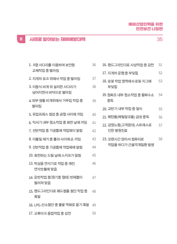 %uc608%ube44%uc0b0%uc5c5%uc778%ub825%uc744 %uc704%ud55c%uc548%uc804%ubcf4%uac74 %ub098%uce68%ubc18II %uc0ac%ub840%ub85c %uc54c%uc544%ubcf4%ub294 %uc7ac%ud574%uc608%ubc29%ub300%ucc45 351. A%ud615 %uc0ac%ub2e4%ub9ac%ub97c %uc774%uc6a9%ud558%uc5ec %ubcf4%uc548%ub4f1%uad50%uccb4%uc791%uc5c5 %uc911 %ub5a8%uc5b4%uc9d02. %uc9c0%uac8c%ucc28 %ud3ec%ud06c %uc704%uc5d0%uc11c %uc791%uc5c5 %uc911 %ub5a8%uc5b4%uc9d03. %uc774%ub3d9%uc2dd %ube44%uacc4 %uc704 %uc124%uce58%ud55c %uc0ac%ub2e4%ub9ac%uac00%ub118%uc5b4%uc9c0%uba74%uc11c %ubc14%ub2e5%uc73c%ub85c %ub5a8%uc5b4%uc9d04. %uc678%ubd80 %uc30d%uc904 %ube44%uacc4%uc704%uc5d0%uc11c %uac70%ud478%uc9d1 %uc791%uc5c5 %uc911 %ub5a8%uc5b4%uc9d05. %uc720%uc555%ud504%ub808%uc2a4 %uc810%uac80 %uc911 %uae08%ud615 %uc0ac%uc774%uc5d0 %ub07c%uc7846. %ubbf9%uc11c%uae30 %ub0b4%ubd80 %uccad%uc18c%uc791%uc5c5 %uc911 %ud68c%uc804 %ub0a0%uc5d0 %ub07c%uc7847. %uc120%ubc18%uc791%uc5c5 %uc911 %uac00%uacf5%ud488%uc5d0 %uc791%uc5c5%ubcf5%uc774 %ub9d0%ub9bc8. %uc774%ubb3c%uc9c8 %uc81c%uac70 %uc911 %ub864%ub7ec %uc0ac%uc774%uc5d0 %uc190 %ub07c%uc7849. %uc120%ubc18%uc791%uc5c5 %uc911 %uac00%uacf5%ud488%uc5d0 %uc791%uc5c5%ubcf5%uc5d0 %ub9d0%ub9bc10. %ud68c%uc804%ud558%ub294 %ub4dc%ub9b4 %ub0a0%uc5d0 %uc2a4%uce74%ud504%uac00 %ub9d0%ub9bc13. %ud0c1%uc0c1%uc6a9 %uc5f0%uc0ad%uae30%ub85c %uc791%uc5c5 %uc911 %uae68%uc9c4 %uc5f0%uc0ad%uc22b%ub3cc%uc5d0 %ub9de%uc74c14. %uc6b4%ubc18%uc791%uc5c5 %uc911(%uc6d0%uae30%ub465 %ud615%ud0dc) %ubc18%uc81c%ud488%uc774 %ub5a8%uc5b4%uc838 %ub9de%uc74c15. %ud578%ub4dc%uadf8%ub77c%uc778%ub354%ub85c %ud3d0%ub4dc%ub7fc%ud1b5 %uc808%ub2e8 %uc791%uc5c5 %uc911%ud3ed%ubc1c16. LPG-%uc0b0%uc18c%uc808%ub2e8 %uc911 %ubd88%uaf43 %uc5ed%ud654%ub85c %uc6a9%uae30 %ud3ed%ubc1c17. %uad50%ub958%uc544%ud06c %uc6a9%uc811%uc791%uc5c5 %uc911 %uac10%uc80416. %ud578%ub4dc%uadf8%ub77c%uc778%ub354%ub85c %uc0ac%uc0c1%uc791%uc5c5 %uc911 %uac10%uc80417. %uc9c0%uac8c%ucc28 %uc6b4%ud589 %uc911 %ubd80%ub52a%ud79818. %ub85c%ubd07 %uc791%uc5c5 %uc601%uc5ed%uc5d0%uc11c %ub85c%ubd07 %uc9c0%uadf8%uc5d0 %ubd80%ub52a%ud79819. %uc815%ud654%uc870 %ub0b4%ubd80 %uccad%uc18c%uc791%uc5c5 %uc911 %ud669%ud654%uc218%uc18c %uc911%ub3c520. %uad50%ubc18%uae30 %ub0b4%ubd80 %uc791%uc5c5 %uc911 %uc9c8%uc2dd21. %uba54%ud0c4%uc62c(%uba54%ud2f8%uc54c%ucf54%uc62c) %uae09%uc131 %uc911%ub3c522. %uac10%uc815%ub178%ub3d9(%uace0%uac1d%uc751%ub300) %uc2a4%ud2b8%ub808%uc2a4%ub85c %uc778%ud55c %ubcd1%uc6d0%uc9c4%ub8cc23. %uc624%ub79c%uc2dc%uac04 %uc549%uc544%uc11c %ucef4%ud4e8%ud130%ub85c %uc791%uc5c5%uc744 %ud558%ub2e4%uac00 %uadfc%uace8%uaca9%uacc4%uc9c8%ud658 %ubc1c%uc0dd3637383940414243444546474849505152535455565758CONTENTS%uc608%ube44%uc0b0%uc5c5%uc778%ub825%uc744 %uc704%ud55c%uc548%uc804%ubcf4%uac74 %ub098%uce68%ubc18I %uac74%uac15%ud55c %uc9c1%uc7a5%uc0dd%ud65c%uc744 %uc704%ud55c %uc548%uc804%ub178%ud2b8 041. %uc0b0%uc5c5%uc548%uc804%ubcf4%uac74%ubc95 %uc0ac%uc5c5%uc8fc %ubc0f %uadfc%ub85c%uc790%uc758 %uc758%ubb342. %uc0b0%uc5c5%uc548%uc804%ubcf4%uac74%uad00%ub9ac %uccb4%uc81c%uc640 %uc9c1%ubb343. %uc548%uc804%ubcf4%uac74%uad50%uc721%uc774%ub780?4. %ubcf4%ud638%uad6c5. %uc791%uc5c5%uc7a5 %ub0b4%uc5d0%uc11c%uc758 %ud1b5%ud5896. %uc704%ud5d8%uae30%uacc4%uae30%uad6c %uc548%uc804%uc7a5%uce587. %uac74%uac15%uc7a5%ud574 %uc608%ubc29%uc124%ube448. %uac10%uc804 %uc7ac%ud574%uc608%ubc299. %uc6b4%ubc18%uc791%uc5c5%uc548%uc80410. %uc218%uacf5%uad6c %uc0ac%uc6a911. %ud654%uc7ac%uc608%ubc2912. %ubb3c%uc9c8%uc548%uc804%ubcf4%uac74%uc790%ub8cc(MSDS)13. %uc704%ud5d8%ubb3c%uc758 %ucde8%uae0914. %uc720%ud574%ubb3c%uc9c8 %ucde8%uae0915. %uc548%uc804%ubcf4%uac74%ud45c%uc9c016. %uc9c8%uc2dd %uc704%ud5d8%uc7a5%uc18c17. %uc0ac%uace0 %ubc1c%uc0dd %uc2dc %uc870%uce58%ubc29%ubc9518. %uc751%uae09%uc870%uce58[%uc548%uc804 tip] %uc0b0%uc5c5%uc7ac%ud574 %ubc1c%uc0dd %uc2dc %uc694%uc591%uc2e0%uccad %uc808%ucc28[%uc548%uc804 tip] %uadfc%ub85c%uc790%uc758 %uad8c%ub9ac%uc640 %uc758%ubb340607081011121415182122242526272931323334%uace0%uad50%uc77c%ud559%uc2b5%ubcd1%ud589 %uc6b0%uc218%uc0ac%ub840%uc9d1_1223.indd 83 2025. 12. 24. %uc624%uc804 11:40