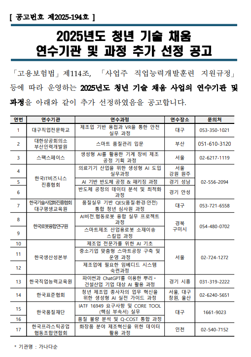 2025년 청년 기술 채움 연수기관 및 과정 추가 선정 공고 작성자 박정태 작성일 2025-10-29 조회수 123 첨부파일 우리 공단에서 추진하는 2025년 청년 기술 채움 사업과 관련하여, 신규 연수기관 및 과정이 선정됨에 따라 아래와 같이 해당 내용을 안내드리오니 많은 관심과 참여를 부탁드립니다. 목록