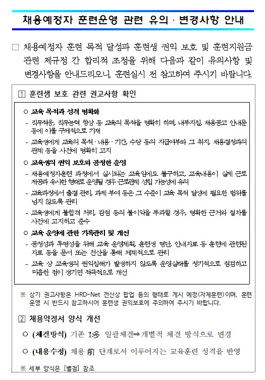 채용예정자 훈련운영 관련 유의·변경사항 안내 작성자 관리자 작성일 2026-01-05 조회수 481 첨부파일 채용약정서 서식.hwp [41472 byte] 사업주 직업능력개발훈련의 일환으로 운영하는 채용예정자 훈련운영 관련 유의사항 및 변경사항에 대해 아래와 같이 안내드리오니 참고하시기 바랍니다. 붙임의 채용약정서 서식 참고하시기 바랍니다. 목록