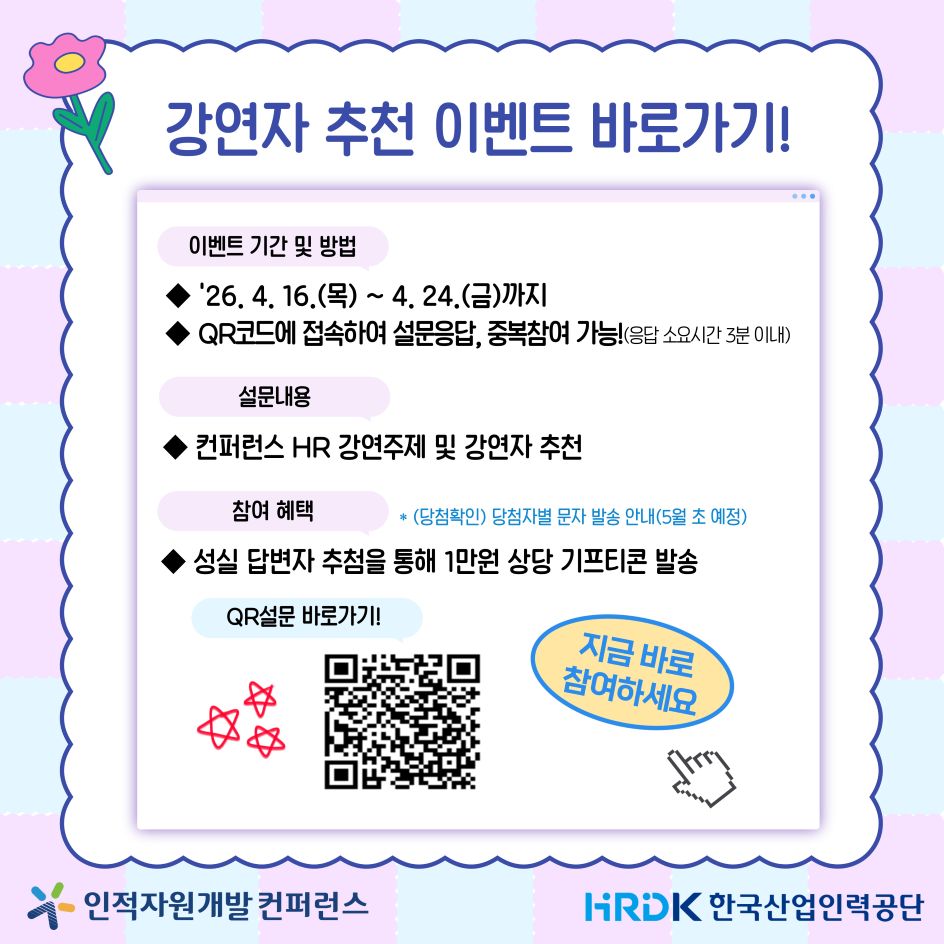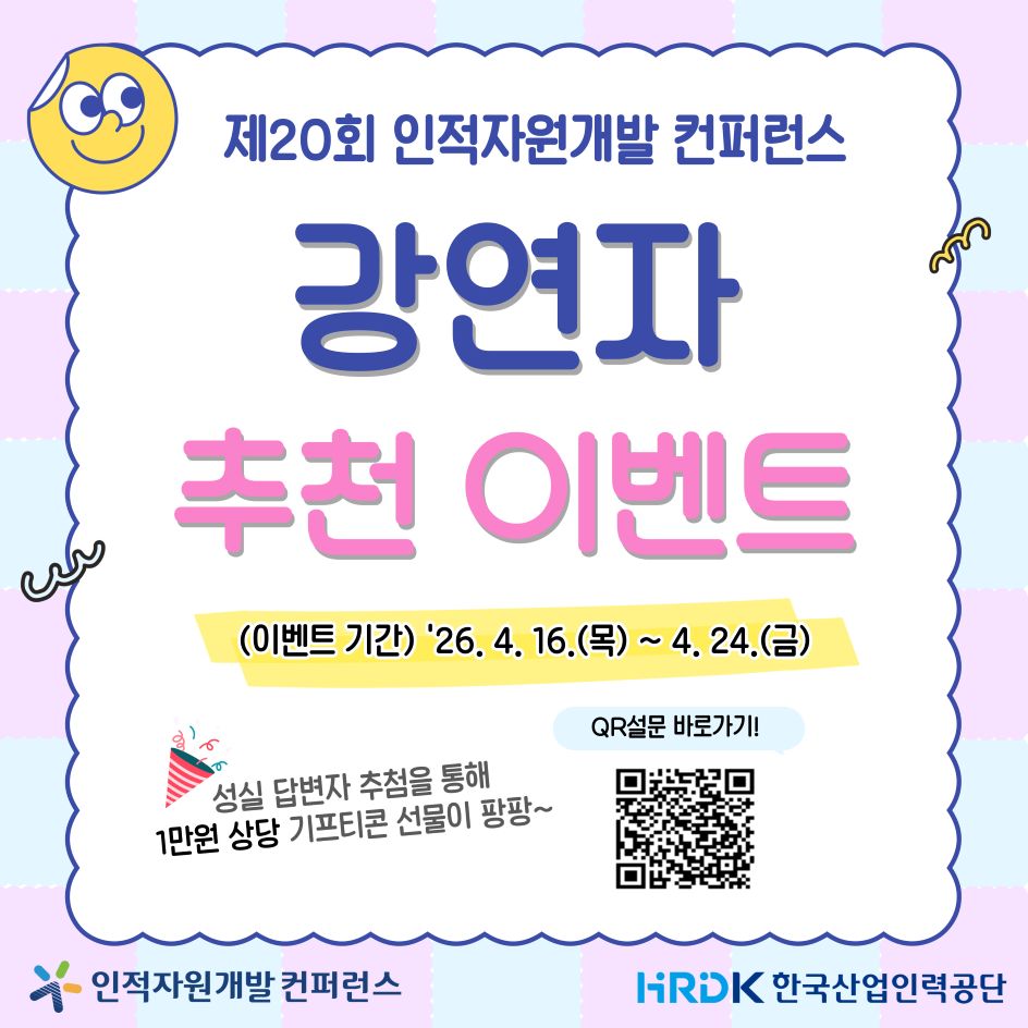 * 강연자 추천 이벤트 기간 : '26. 4. 16.(목) ~ 4. 24.(금)- 아래 카드뉴스 QR설문 응답을 통해 이벤트 참여, 응답 소요시간 3분이내, 중복 참여 가능!- 성실 답변자 중 추첨을 통해 1만원 상당 기프티콘을 드립니다!<2026년 제20회 인적자원개발 컨퍼런스 개요>