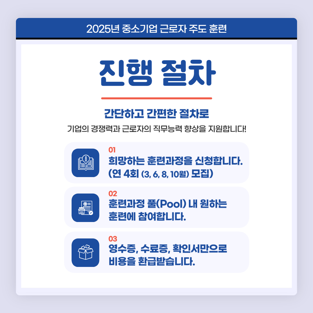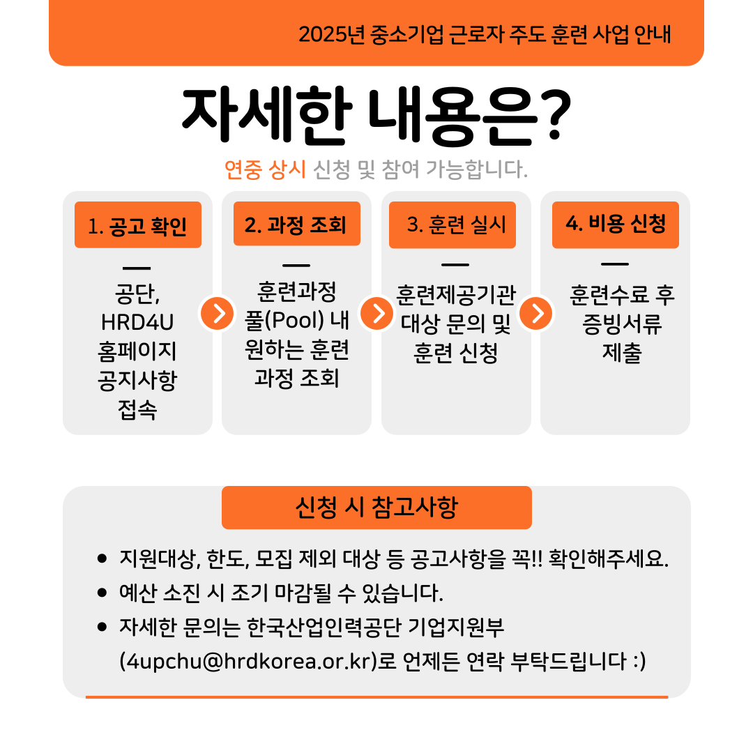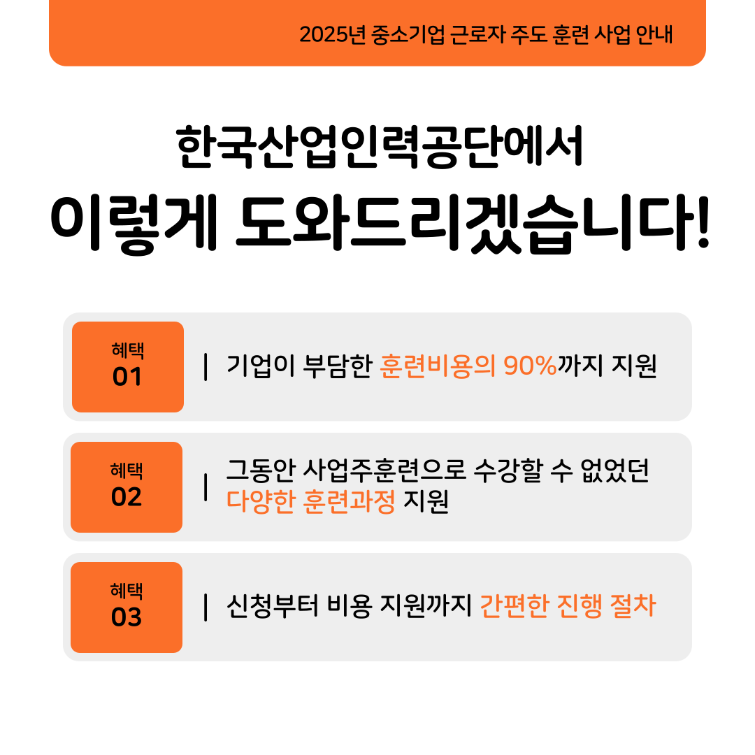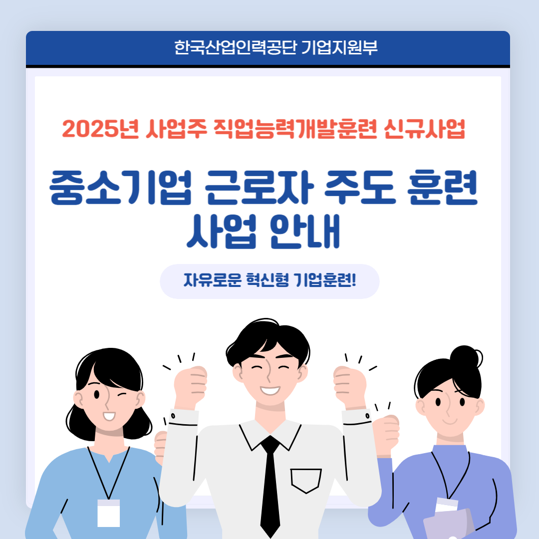 "중소기업 근로자 주도 훈련"이란 근로자가 원하는 훈련에 참여할 수 있도록 기업이 훈련비를 지원하면 사업주가 부담한 비용의 90%까지 지원하는 제도입니다. 근로자가 필요로 하는 훈련을 사업주가 적은 부담으로 지원해 줄 수 있어 좋고, 근로자 역량 향상으로 기업의 경쟁력도 높아질 수 있는 좋은 기회이니 관심있는 분들의 많은 참여 부탁드립니다. 자세한 사항은 반드시 아래 내용을 확인해주시기 바랍니다:)